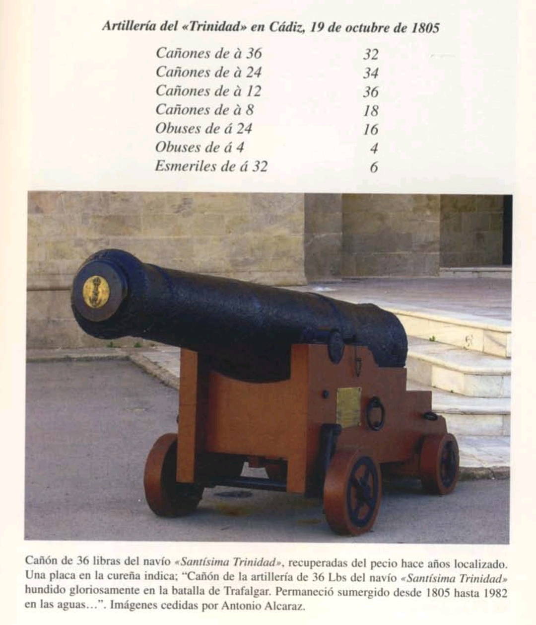 А это страничка из книги Хуана Карлоса Мехиас Таверо (Juan Carlos Mejías Tavero) на ней перечислена вся артиллерия с которой "Сантисима Тринидад" вышел в море из Кадиса 19 октября 1805 года. Слово "obuses" означает "гаубицы" калибр 24 и количество 16.