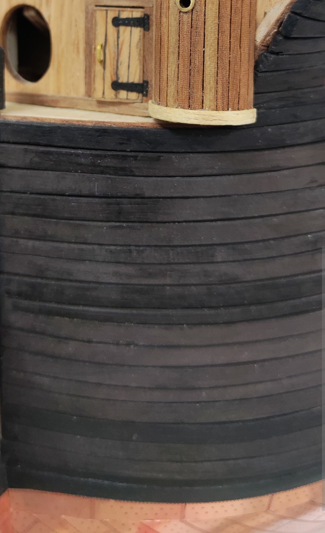 Юрий Васильевич Трошкалев писал(а): 15 фев 2024, 12:08 , и на нижнем корпусе кормовой части , нужно одним цветом - черным шпоном чистовым клеить по всему корпусу корабля и на черной окантовке вырезать порты , где порты не нужен коричневый орнамент обрисовки - портов , и нужно делать по всему корпусу - верхних палуб , с носовой части корпуса и до кормовой части - перила оформление и на перил вставлять вставки для такелажа - обвязывание мачт и парусов ,