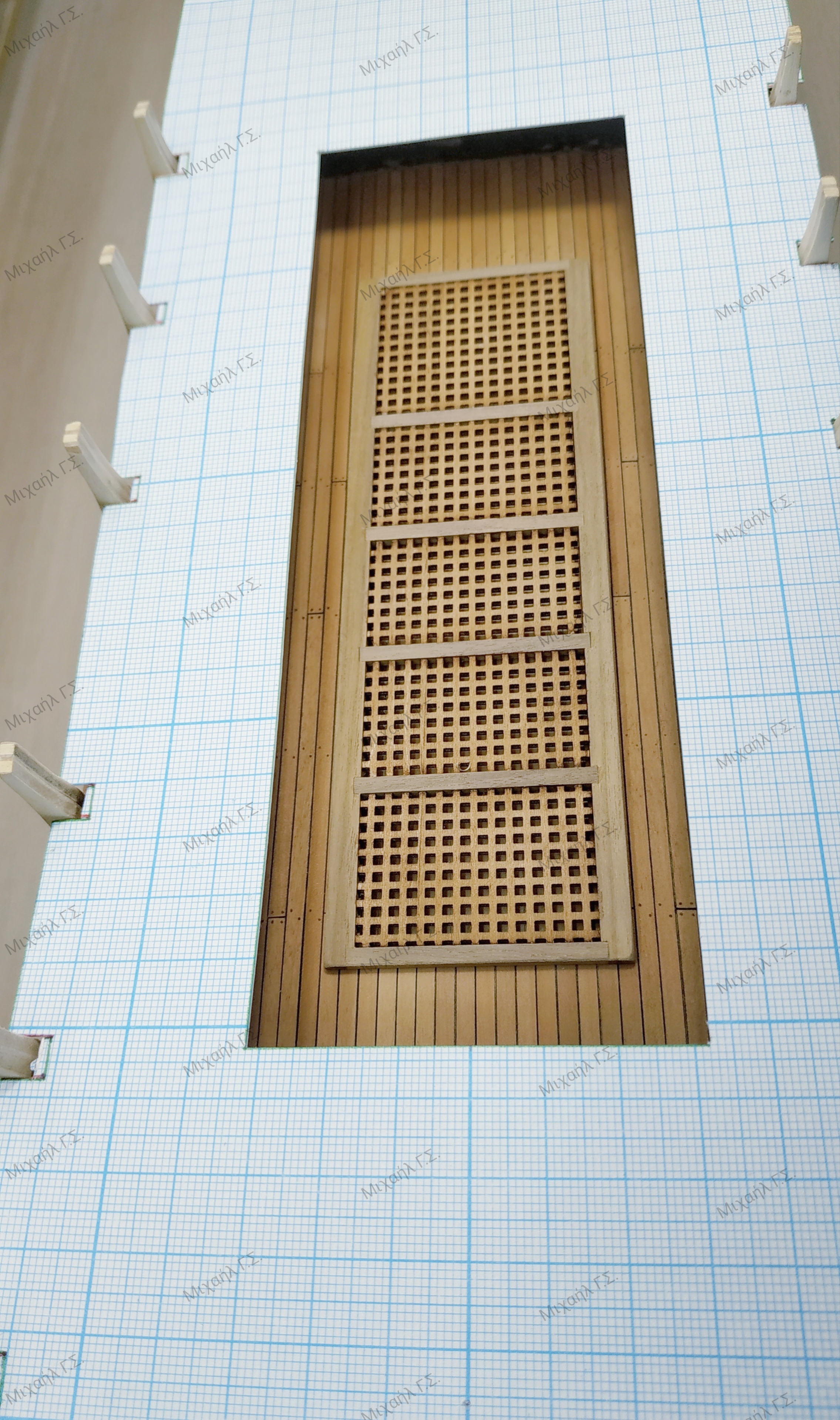 На последнем фото вид с шаблоном будущего проёма по верхней палубе. По нему видно как немного из проделанной работы будет просматриваться в будущем на моделе. А если мы ещё вспомним, что на решётке будут шлюпки стоять, то и её будет совсем чуть-чуть видать... но с этим уж ничего не поделать.
