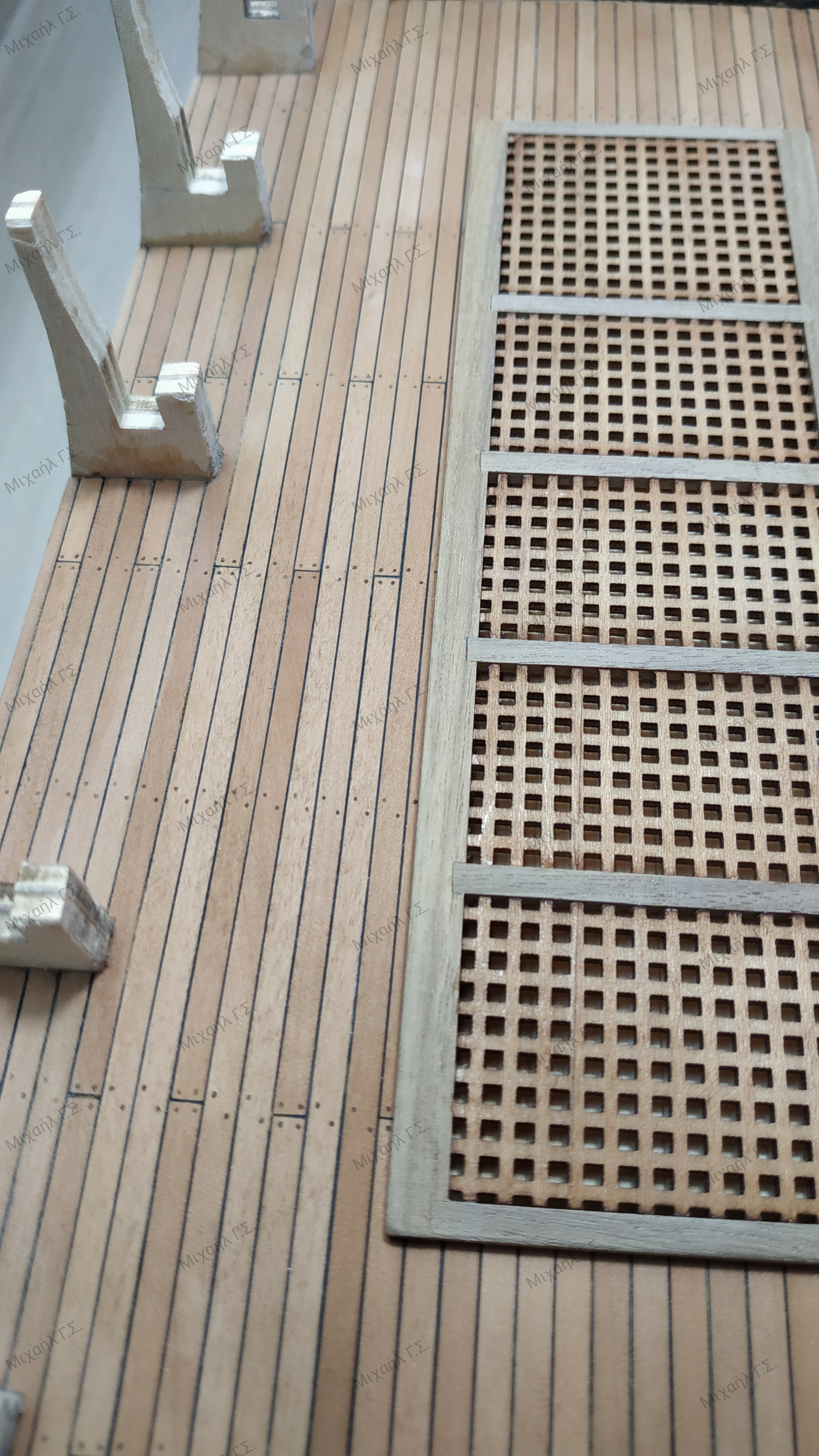 Решётку, которая шла с журналом, я переделал, но к палубе её ещё не крепил, просто положил сверху для фото. Планирую ещё сделать к ней ячейки, которые идут вдоль неё, для размещения ядер, и сделать небольшие нагеля, которые будут имитировать крепление обвязки решётки к палубе.