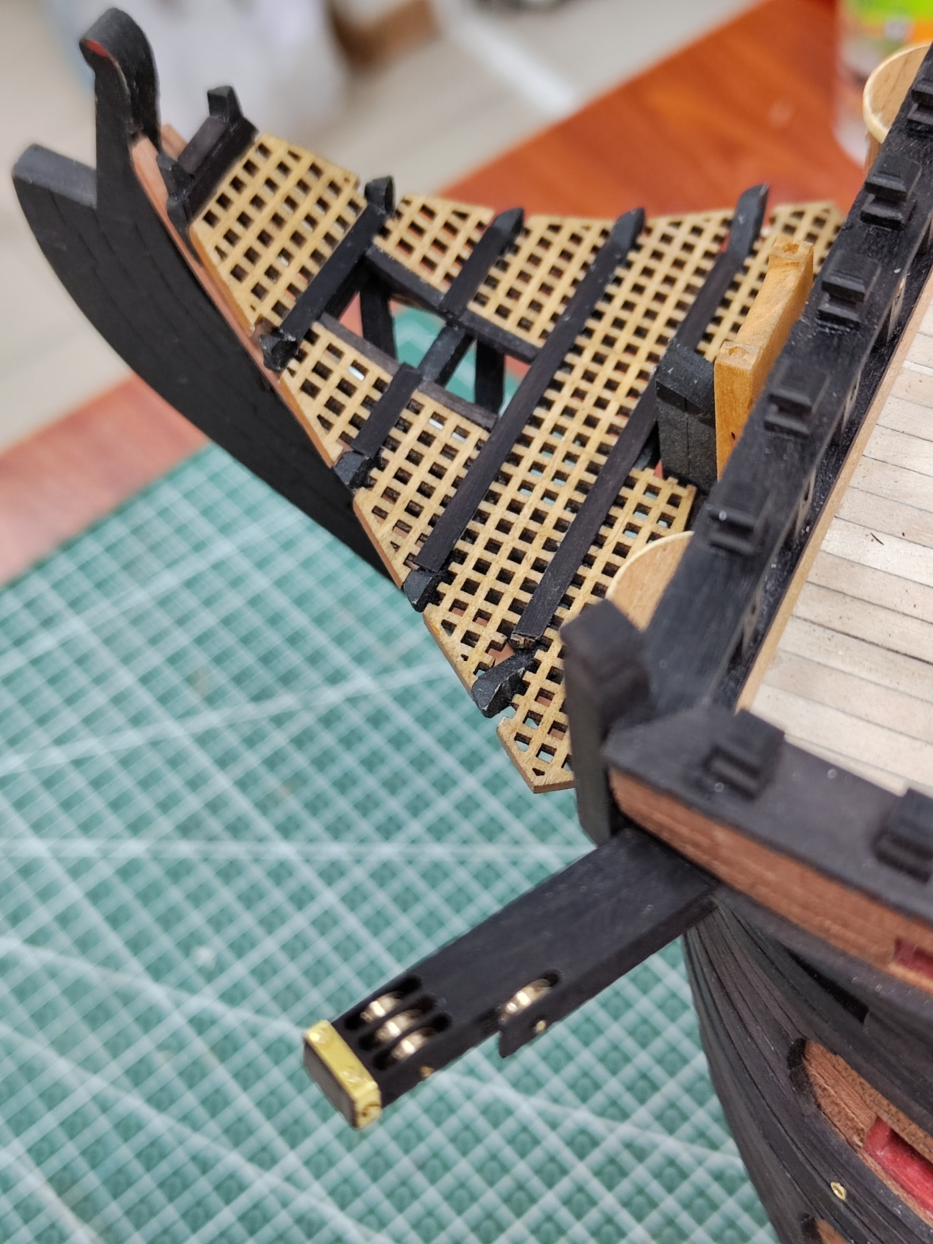 Поддерживаю. Трапы, ведущие на рустерные решетки - это нонсенс. Решетки - это главные грузовые люки. При загрузке корабля они снимаются, тяжелые и габаритные грузы опускаются в трюм талями. Но, одновременно, сотня матросов бегает с мешками на плечах по трапам. Поэтому двух трапов явно недостаточно для такого корабля, либо они должны быть как на "Виктори" - широкими.