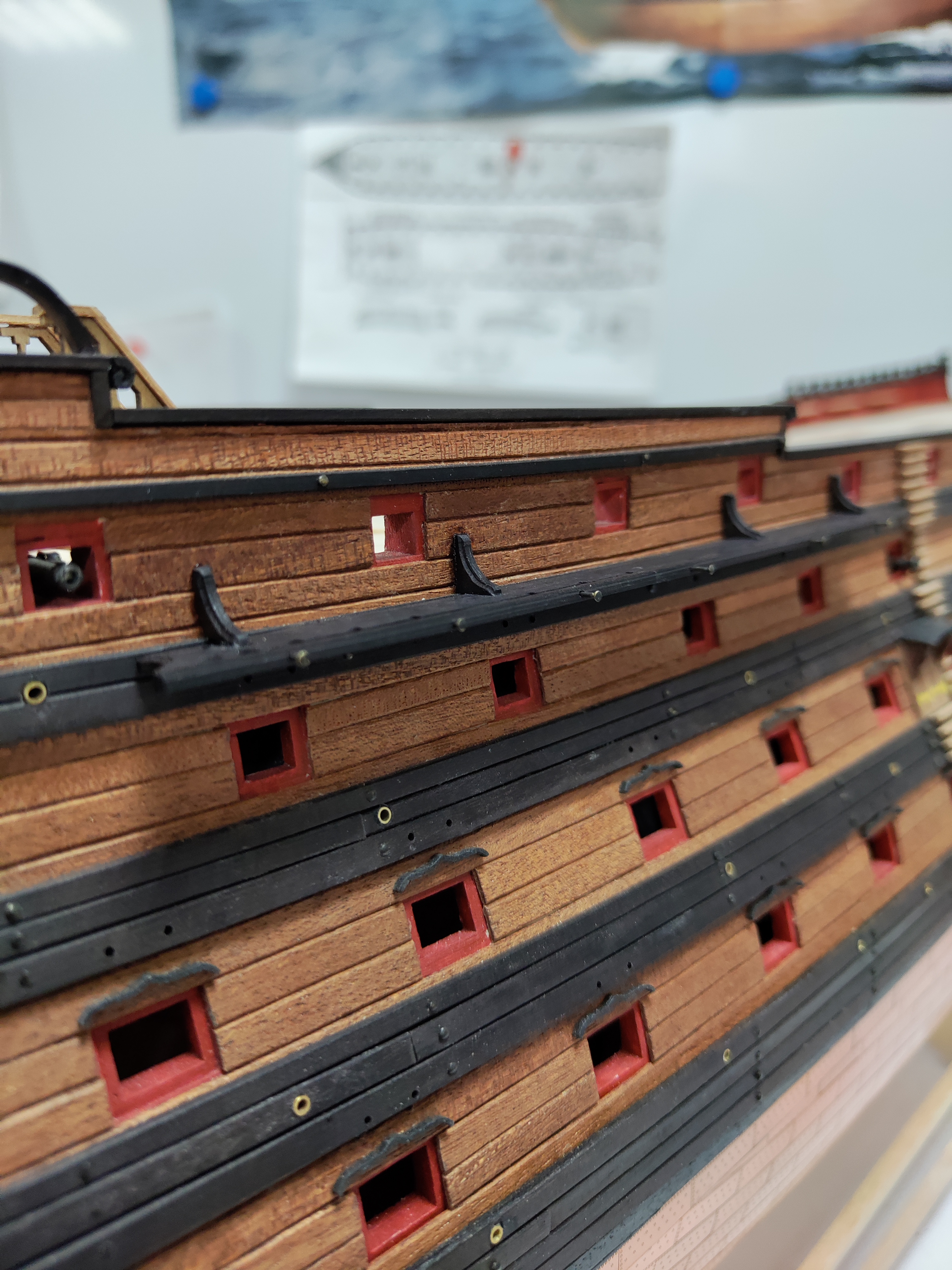 Добрый день всем, кто строит СТ. Установил все руслени. Те которые были в наборе использовал как шаблоны. Изготовил из черного граба. Вопрос ко всем , кто уже занимается такелажем на СТ. Есть ли на русленях рым болты, а если есть то где они расположены. В инструкции я что-то их на русленях не нашёл.