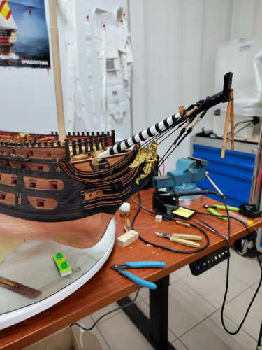 Закончил обвязку бушпритного дерева. Остались штаги и леера которые будут проведены после установки фок мачты и бакштаги утлегарей после установки блинды и бом - блинда рей.