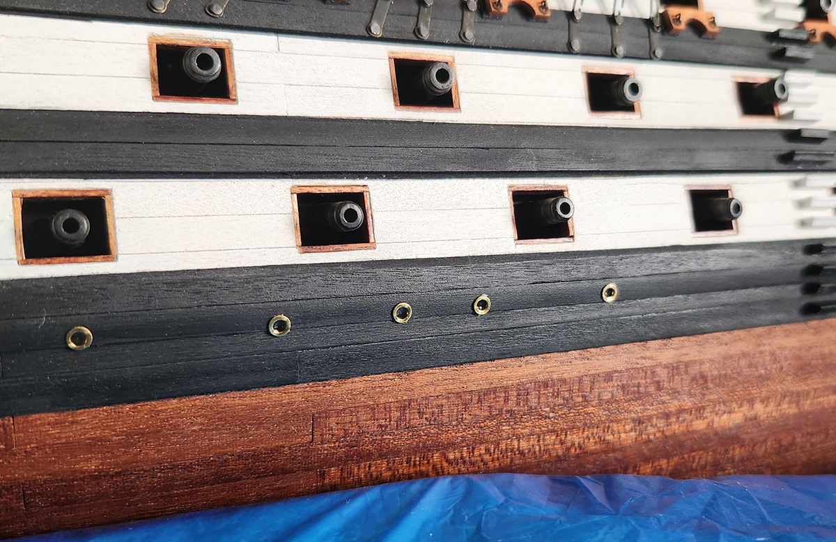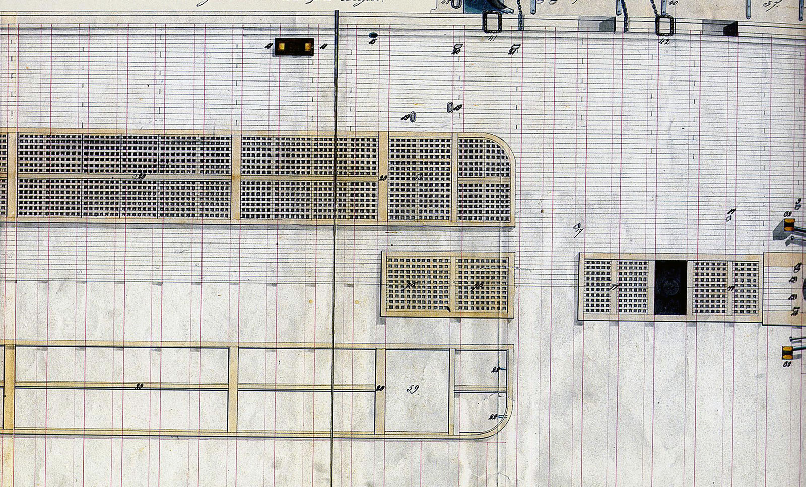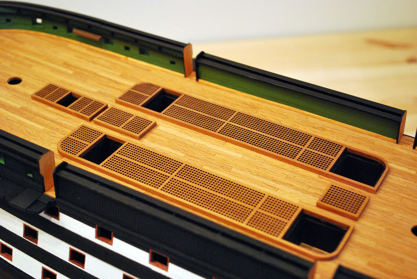 Фальконетовские рустерные решетки хорошо ложатся в чертеж палубы, но немного не совпадают с отверстиями люков на палубе патворка. Пришлось немного подкрасить черным цветом края.