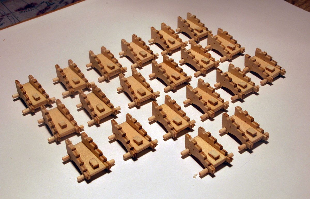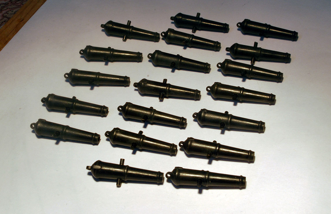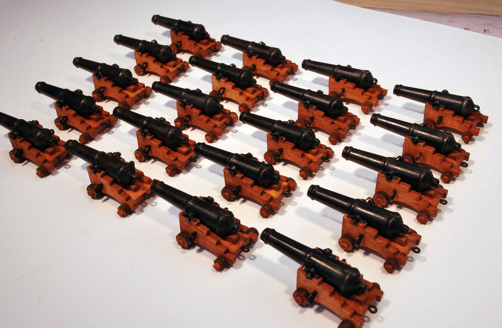 Первая пушка из первых номеров журнала, ничего не знал, покрыл лафет лаком, а ствол краской Gun Metal. Оси колес из проволоки. Когда вернулся к остальным пушкам, сделал по другому - закрасил фанерные торцы лафетов, покрыл маслом, оси сделал из зубочисток, стволы зачернил Brass Black.