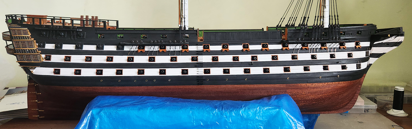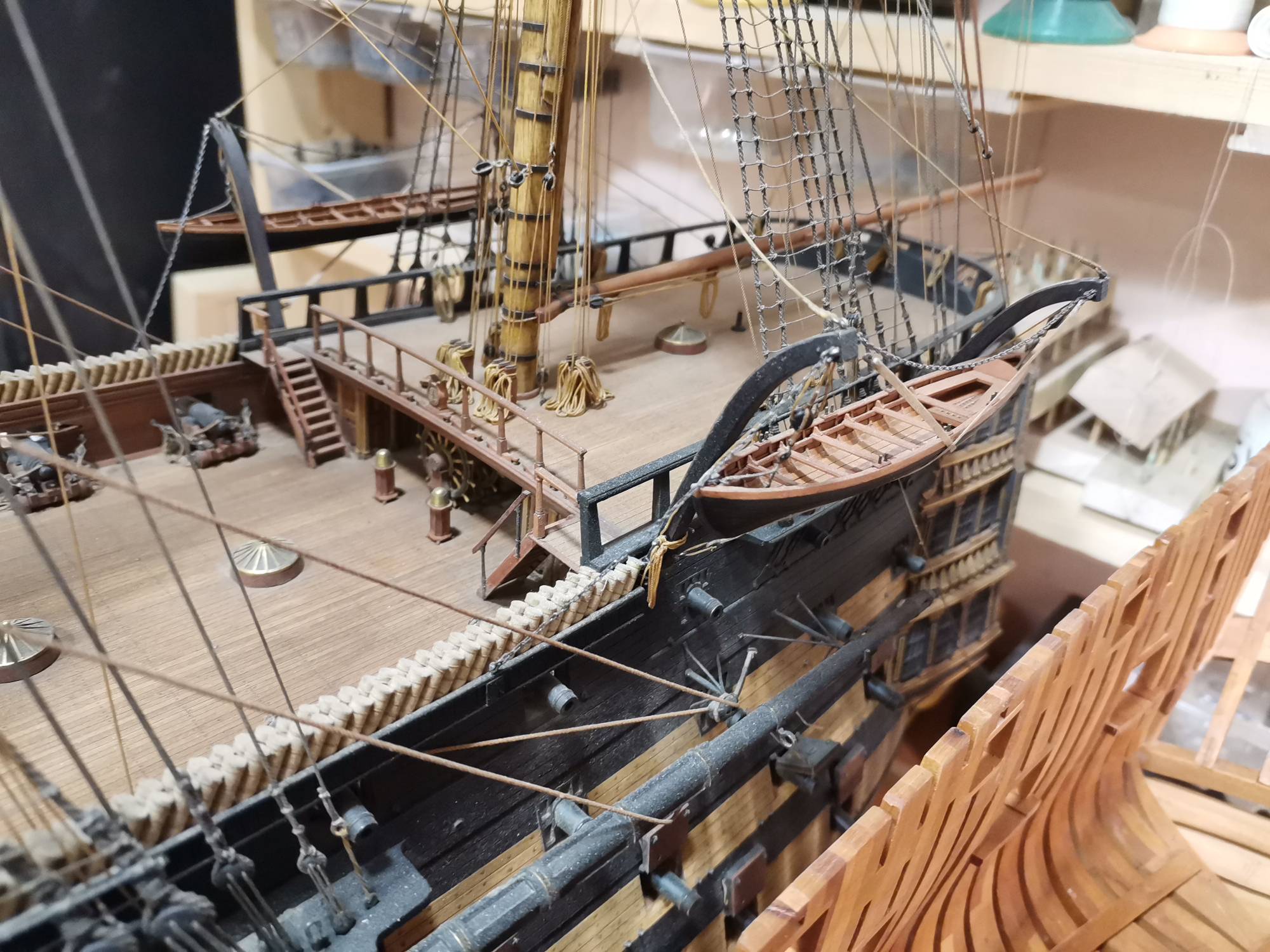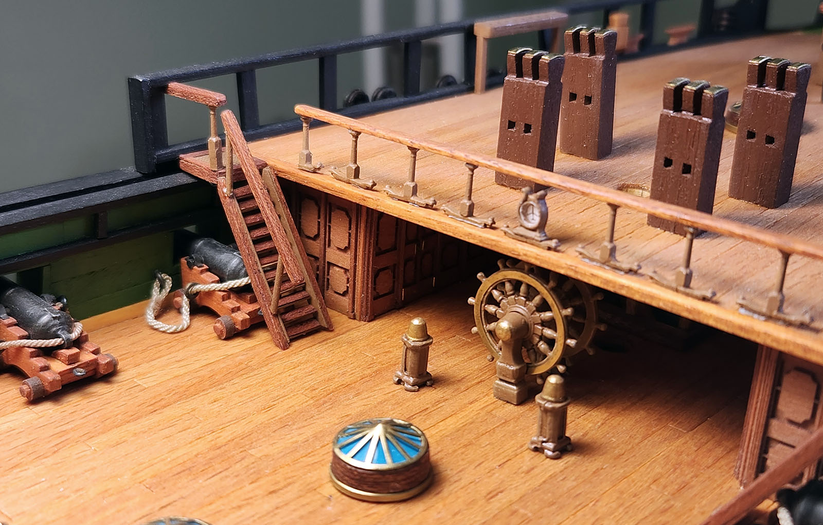 4) укоротить ют с переносом трапов. Закрывать и сдвигать порты, когда уже все прорезано - не дело, да и на вид сбоку корабля будет уже не похоже. Укоротить палубу - тоже оказалось совсем не просто, там переделывать и ограждение юта и положение бизань-мачты сместится. Такие решения надо принимать на уровне сборки силового каркаса. А это первый корабль, опыта нет, собрать аккуратно по инструкции - уже достижение. Да и сам формат патворка, когда видишь только этап постройки без представления конечного результата, свое дело сделал.