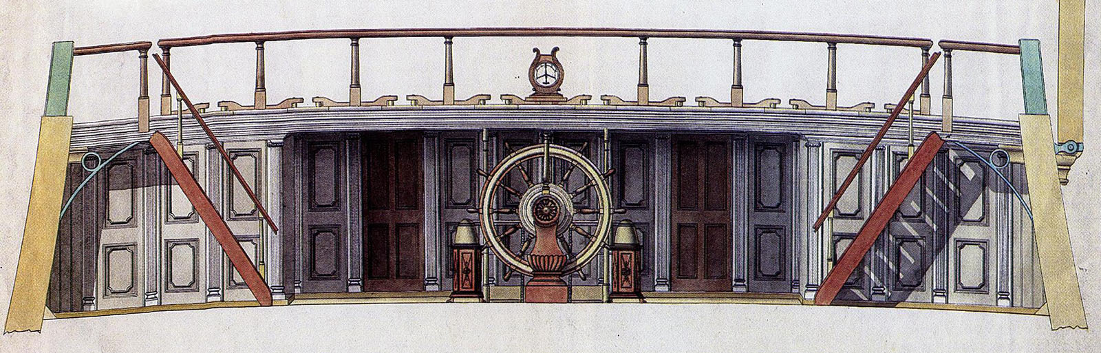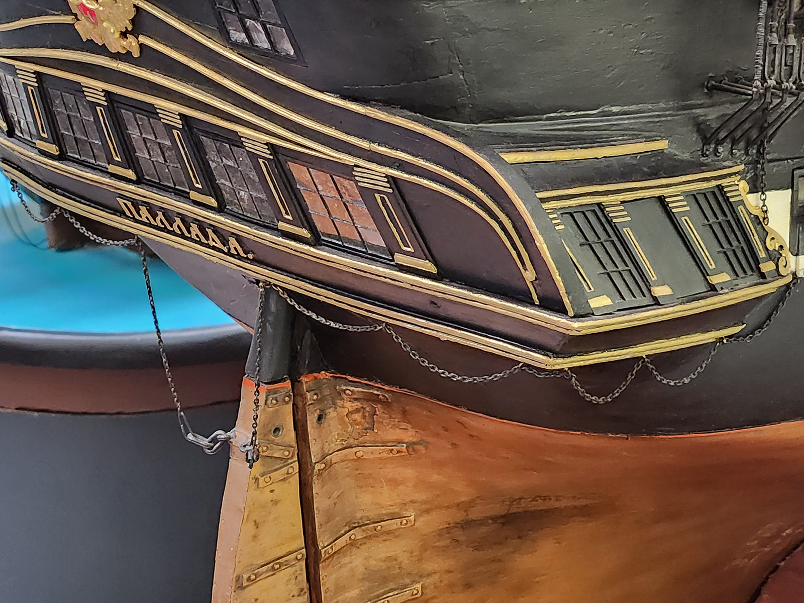 Добавил цепи со скобой крепления к рулю. В патворке там пустое место. Устройство этого узла хорошо видно на модели "Паллада" в ЦВММ.