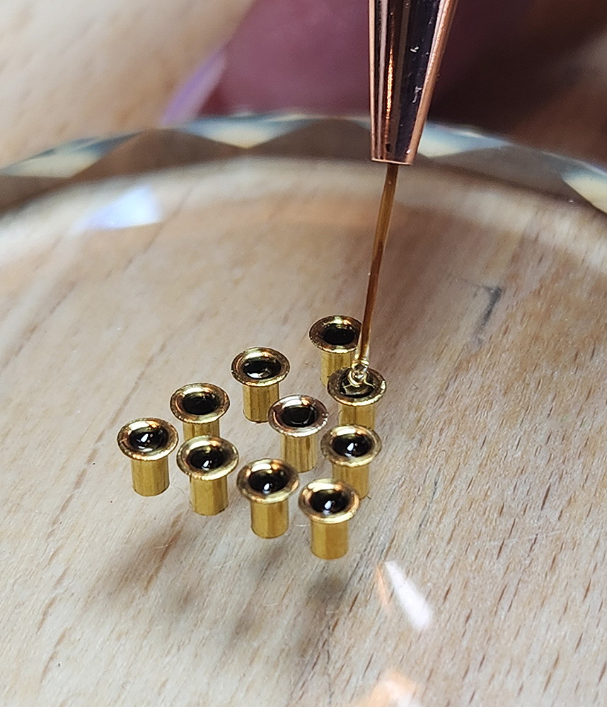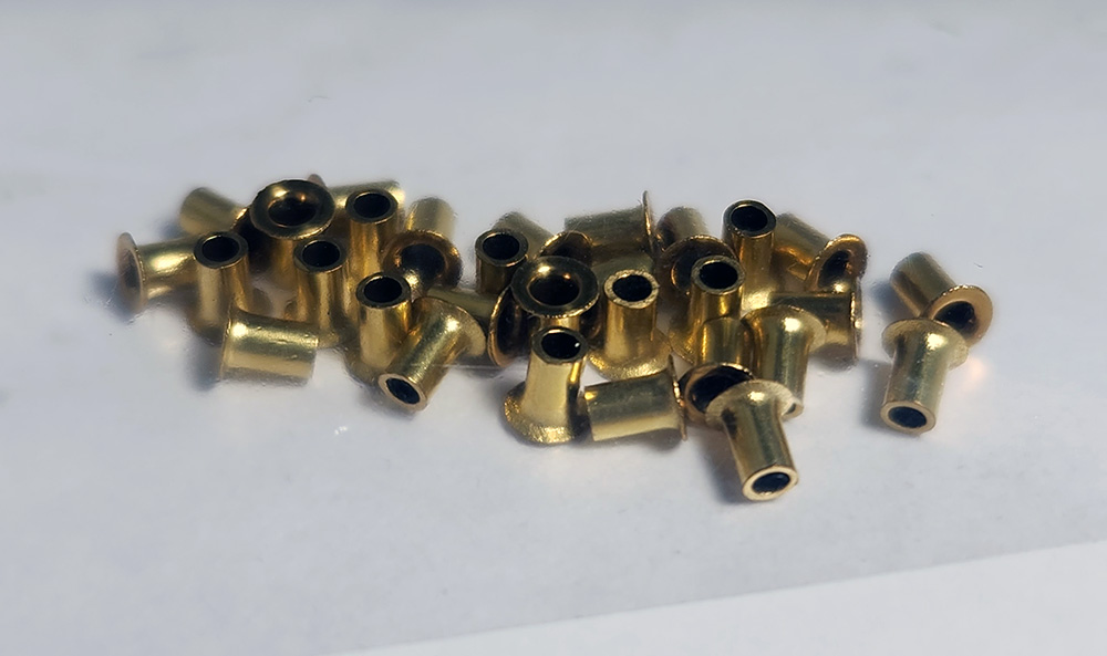 Вспомнил, что хотел сделать иллюминаторы. В патворке они не предусмотрены, а на чертеже, если постараться их можно найти. В нашем масштабе иллюминаторы около 2 мм. Прикупил заклепки из латуни, самые маленькие которые нашел - внутренний диаметр 2 мм, внешний 3 мм, по 10 рублей штука. Для имитации стекла пришли на помощь ногтевые технологии - надо нанести тонкой кистью лак, полимеризующийся под УФ-лампой.