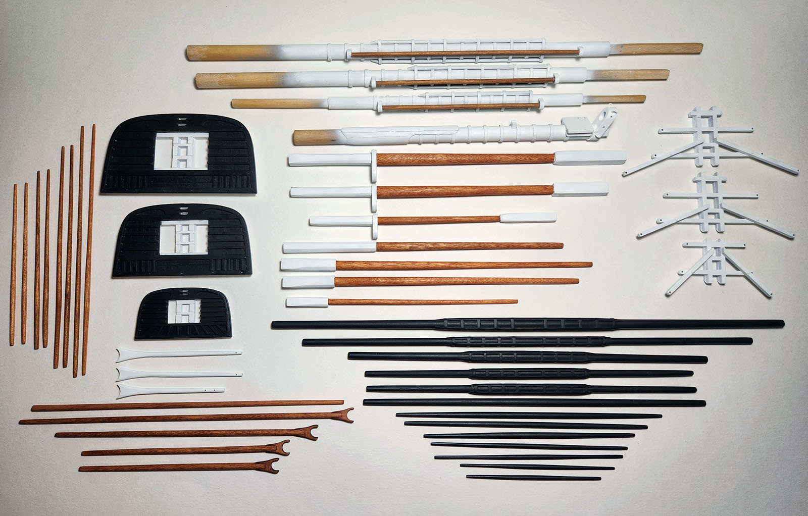 Заготовил и окрасил рангоут. Цвета брал с моделей в ЦВММ - мачты белые, эзельгофты белые, трисель-мачты неокрашеные, стеньги неокрашеные и у топа мачты белые, бушприт белый, мартин-гик и усы белые, утлегарь и бом-утлегарь неокрашеные, марсы сверху черные, снизу белые, салинги белые, реи черные, лисель-спирты неокрашеные, гафели и гик неокрашеные. На бушприт добавил бугели, которых нет в журнале.