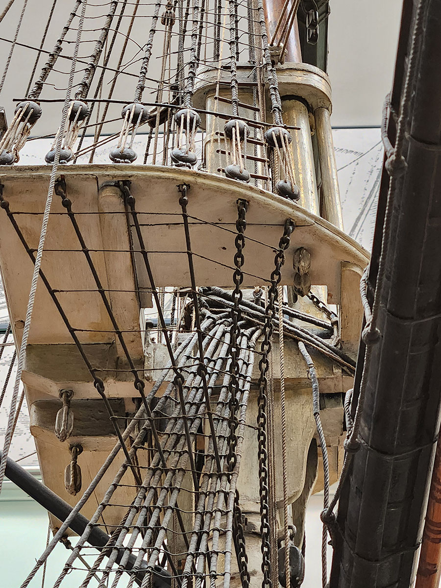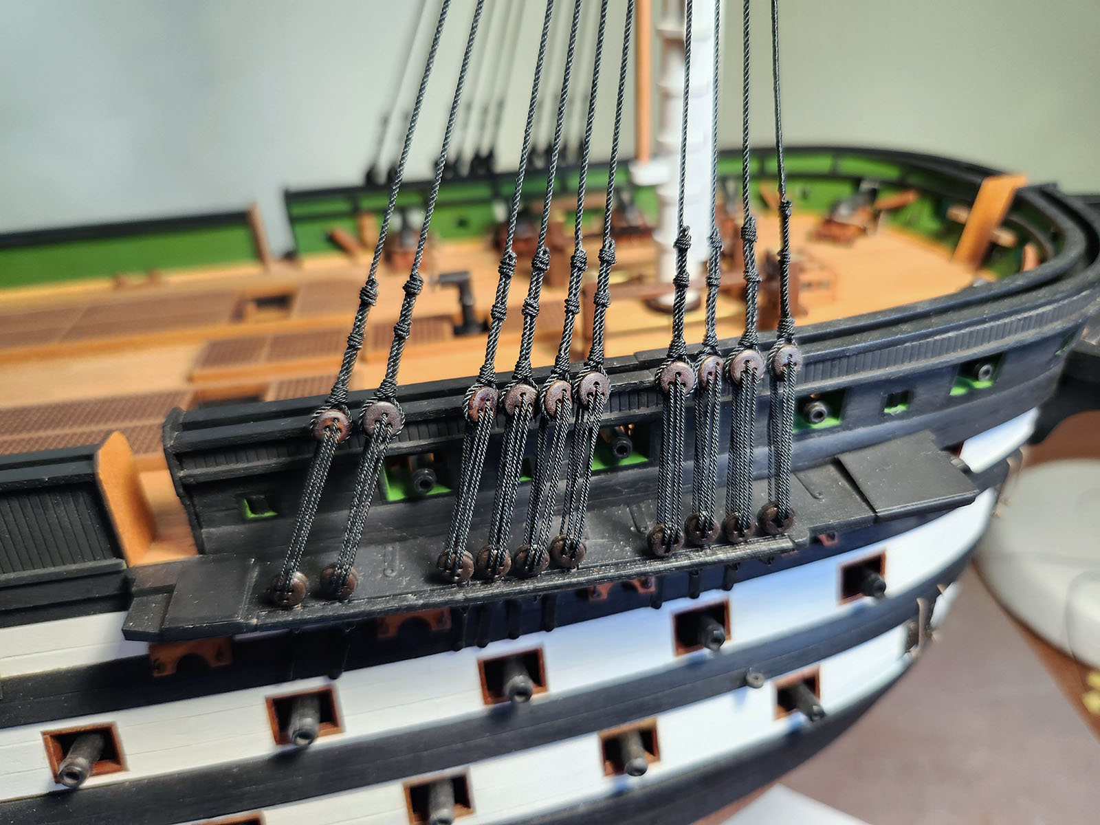 Начинаю такелаж, поехали! Нить в патворке не очень хорошая, непослушная, ворс присутствует и пыль потом здорово собирает. Поэтому мотаю канатики сам, обычным ручным тросомотом. Крайне рекомендую, если начать мотать, на нитки в наборах и не взглянешь. Намотал канатиков на ванты и талрепы.