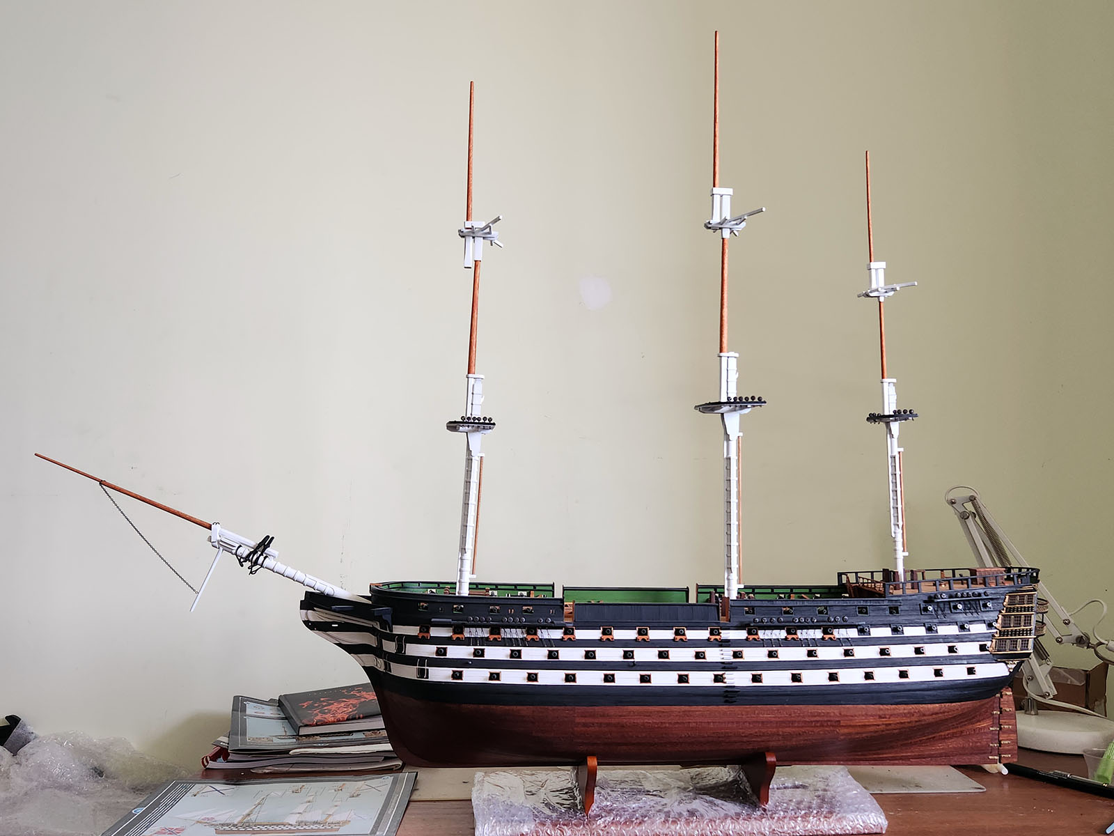 Ну что можно сказать? Мачты стоят на своих местах, угол наклона бушприта совпадает. Фок-мачта с учетом надставки флагштока будет правильной длины, грот-мачта чуть коротковата, бизань-мачта OK. Марсы и салинги на приемлемой высоте. Бом-утлегарь коротковат, надо сделать надставку на штифте.