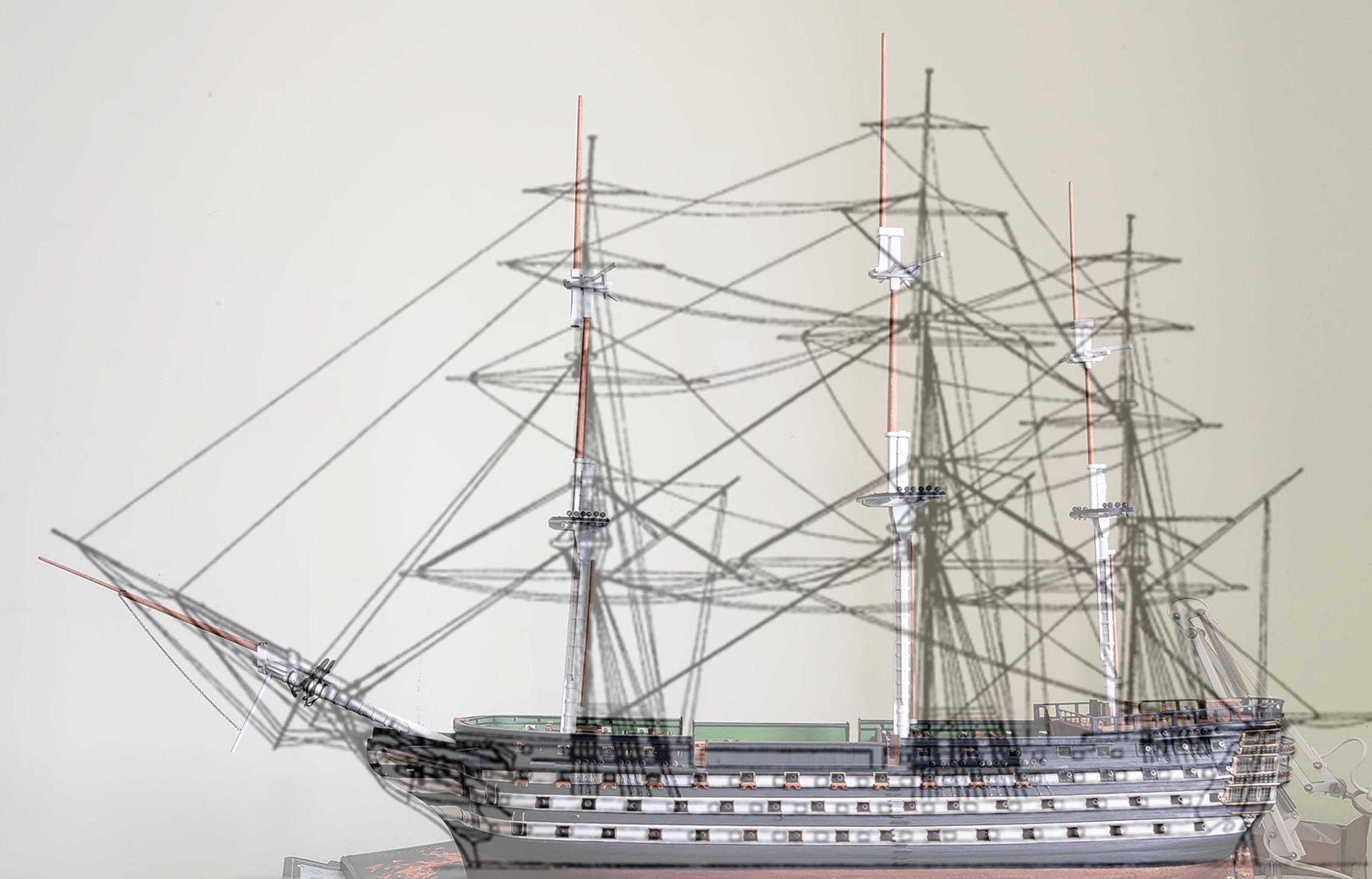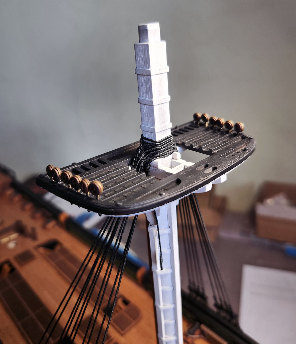 Ванты ставил как на настоящем корабле - у парной ванты делал огон, клетневал, ввязывал юферсы и уже готовую ванту одевал на топ мачты и натягивал. Все как показано у Сарычева.