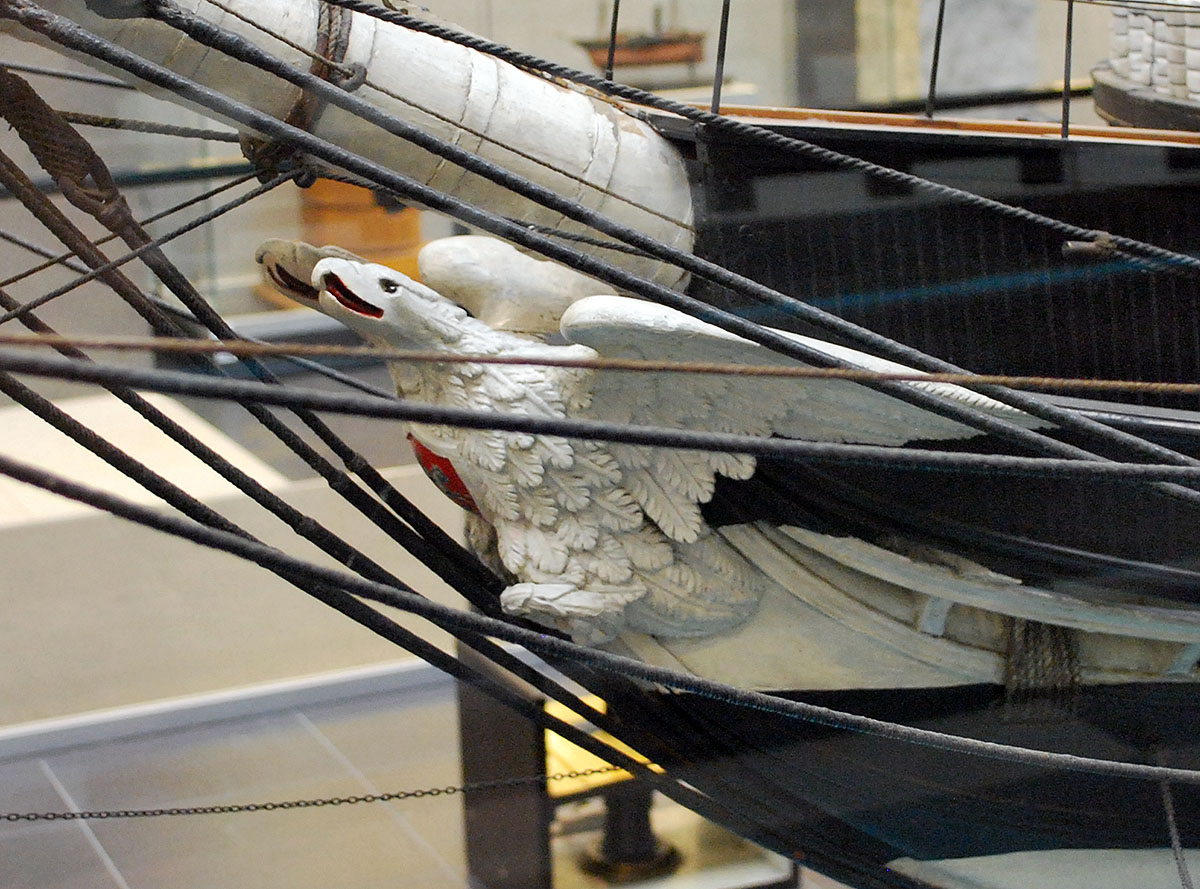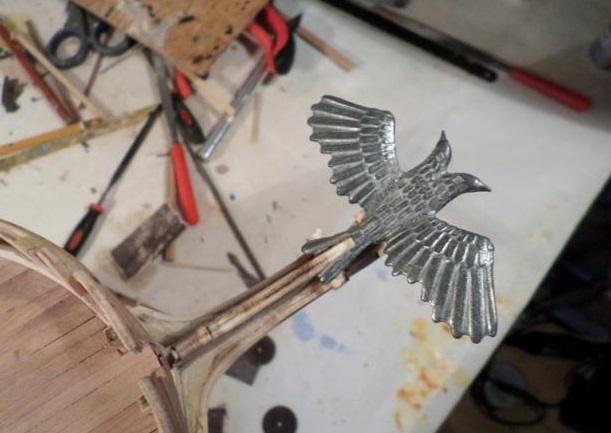 Носовая фигура орла из журнала не очень подходит для установки - большой размер, широко расправленные крылья, мало похожа на орла. Судомоделисты метко назвали ее "воробьем". Как должен выглядеть орел можно посмотреть на моделях ЦВММ и чертеже. Но где взять другую фигуру, если навыками резьбы по дереву или скульптуры не владеешь? Купить готовую. Такая фигура двухглавого орла нашлась в патворке "Штандарт". Правда пришлось с ней изрядно повозиться. Во-первых, у нее не было лап и пришлось трансплантировать лапы от исходной фигуры. Во-вторых, она никак не хотела садиться на княвдигед. Пришлось его нарастить, а в фигуре орла подрезать паз бор-машинкой. В итоге хоть орел и не очень похож на изображенного на чертеже, но имеет грозный и стремительный вид, сидит в правильном положении.