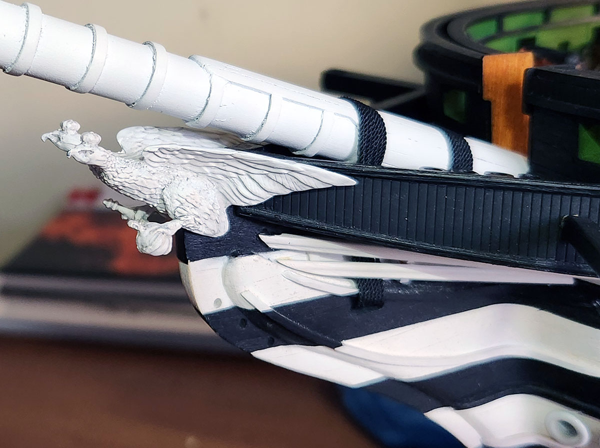 При окраске пробовал корону и лапы в золото, но не понравилось, строгость военного корабля пропадает. Решил оставить все в белом цвете, только выделил рельеф.