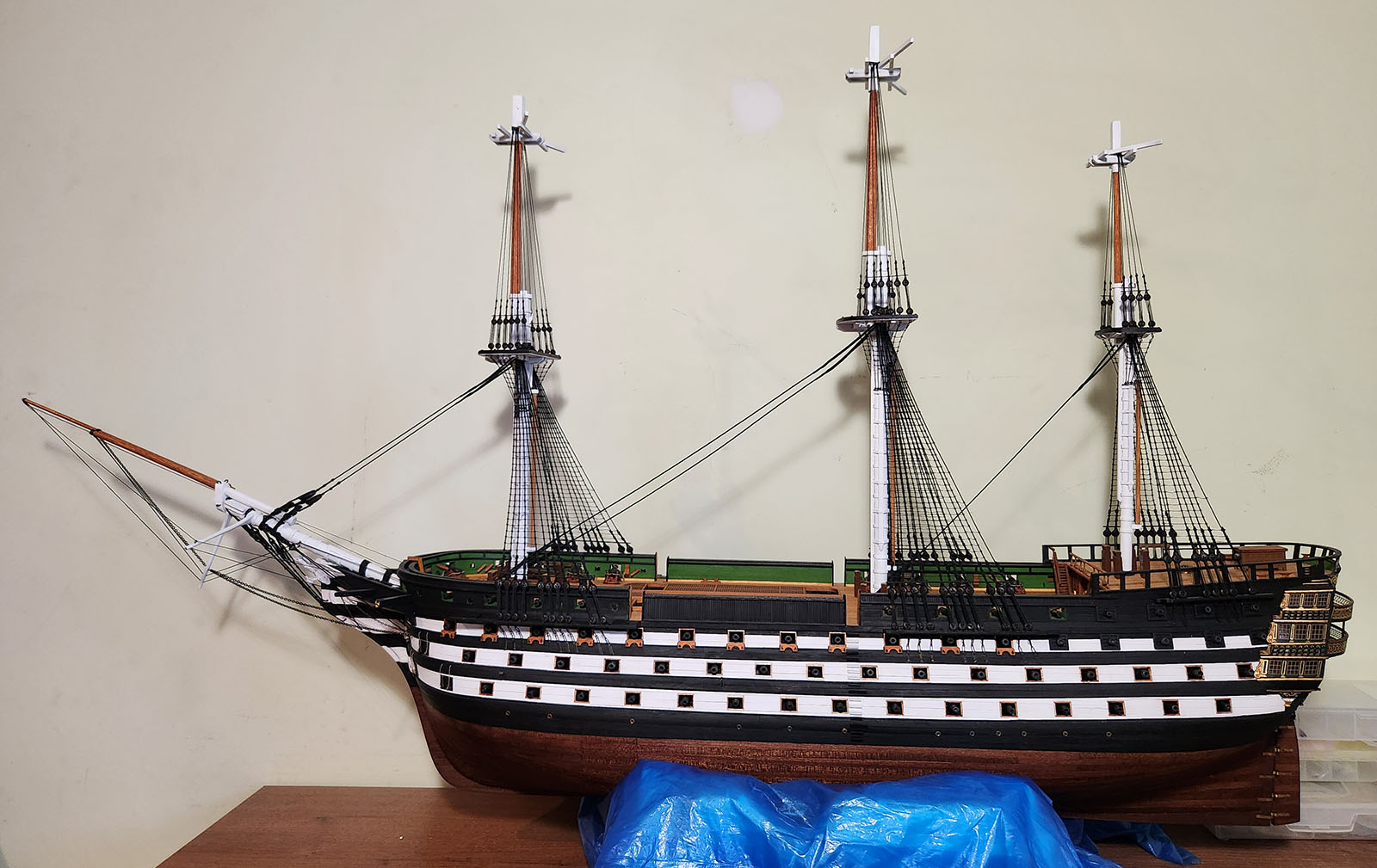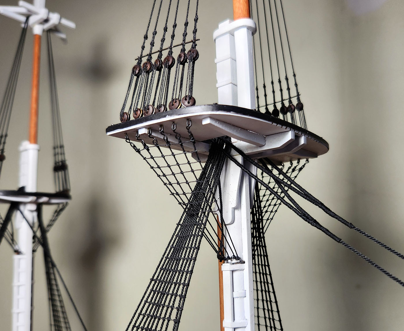 Такелаж у марса сложное, но и красивое место. Хотелось сделать хотя бы близко к правильному варианту. Характерно для того периода времени - верхний ворст отсутствует, путенс-ванты идут прямо к мачте. Нижние ванты закончены.