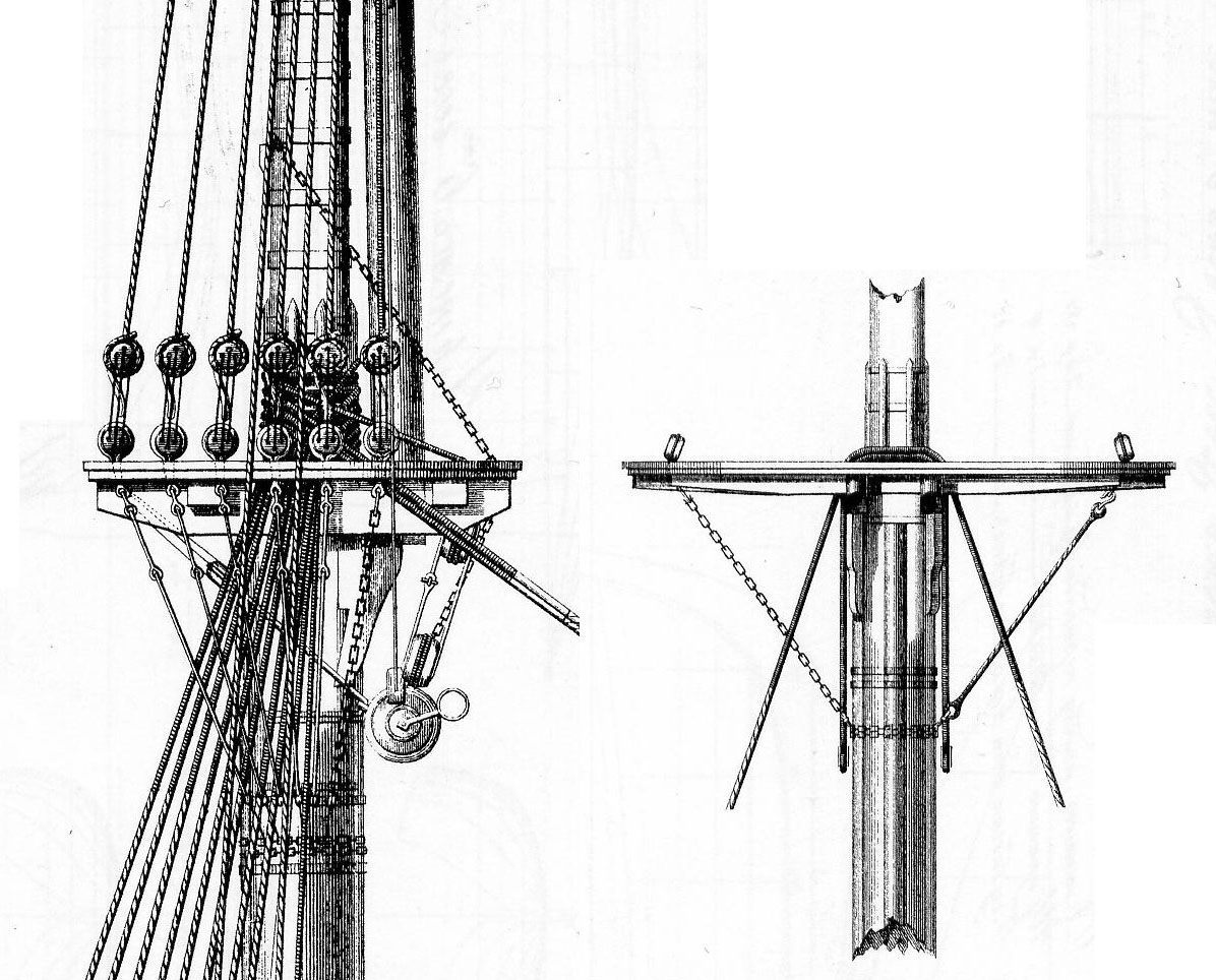 Так ничего ближе по времени и точнее нет. Штатное положение 1840 г. и книга Посьета с альбомом чертежей. Причем Посьет приводит разные варианты обвязки такелажа с приемуществом и логикой использования того или иного варианта. Например, утлегарь-штаг мог быть тросовым или цепным. В обиход входили цепные, в альбоме для большого корабля показан цепной. У моделиста конечно есть выбор, но логичнее для флагмана ЧФ поставить цепной.