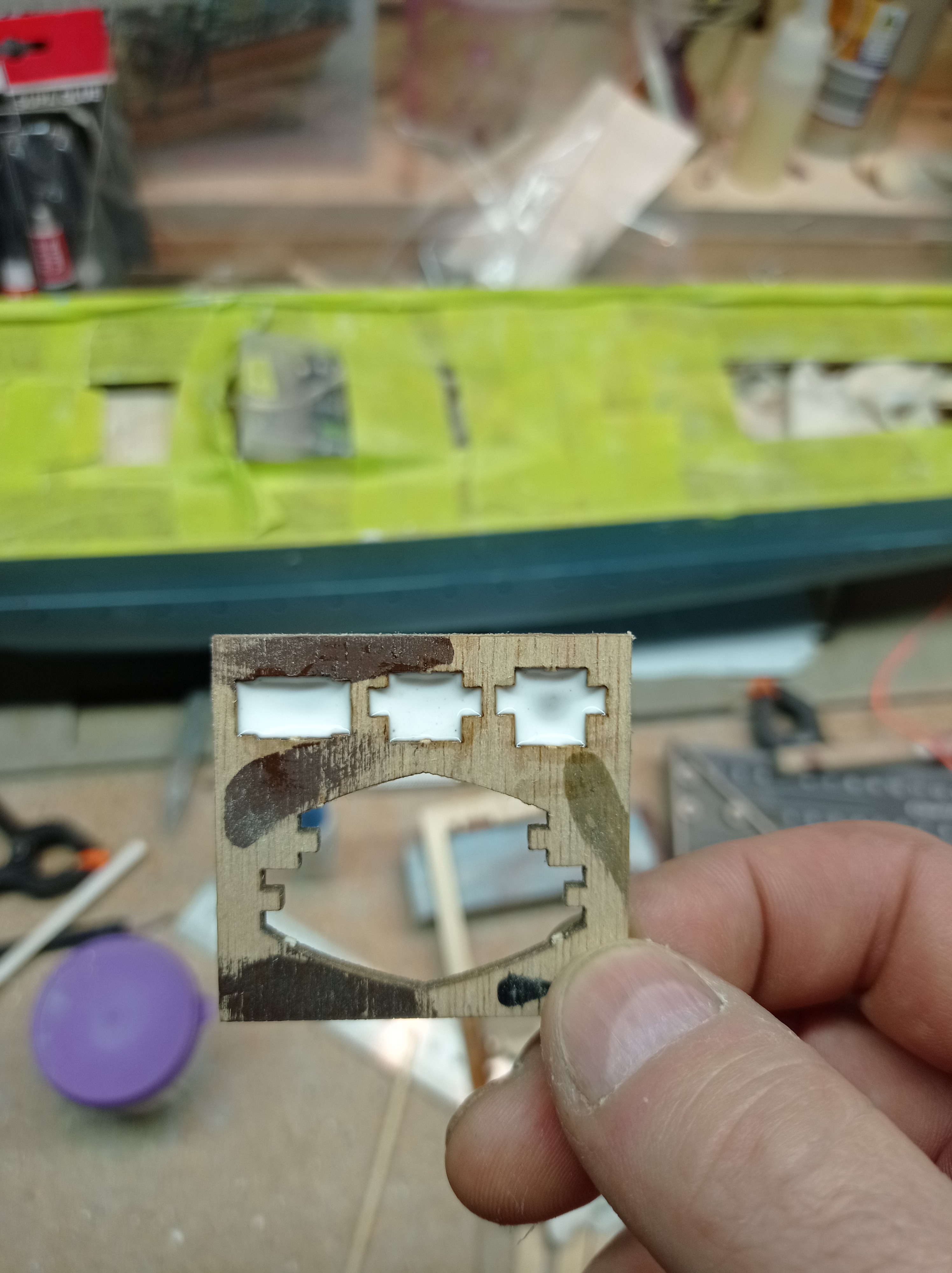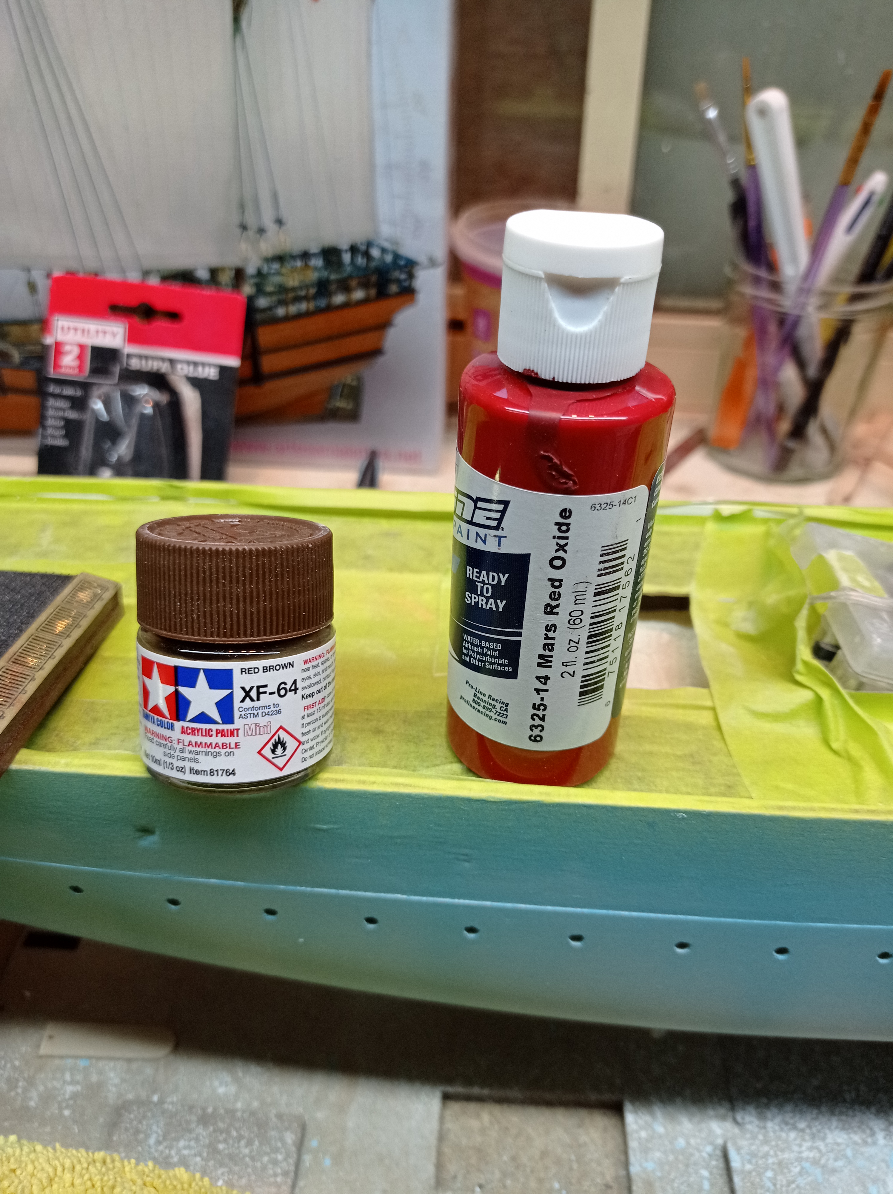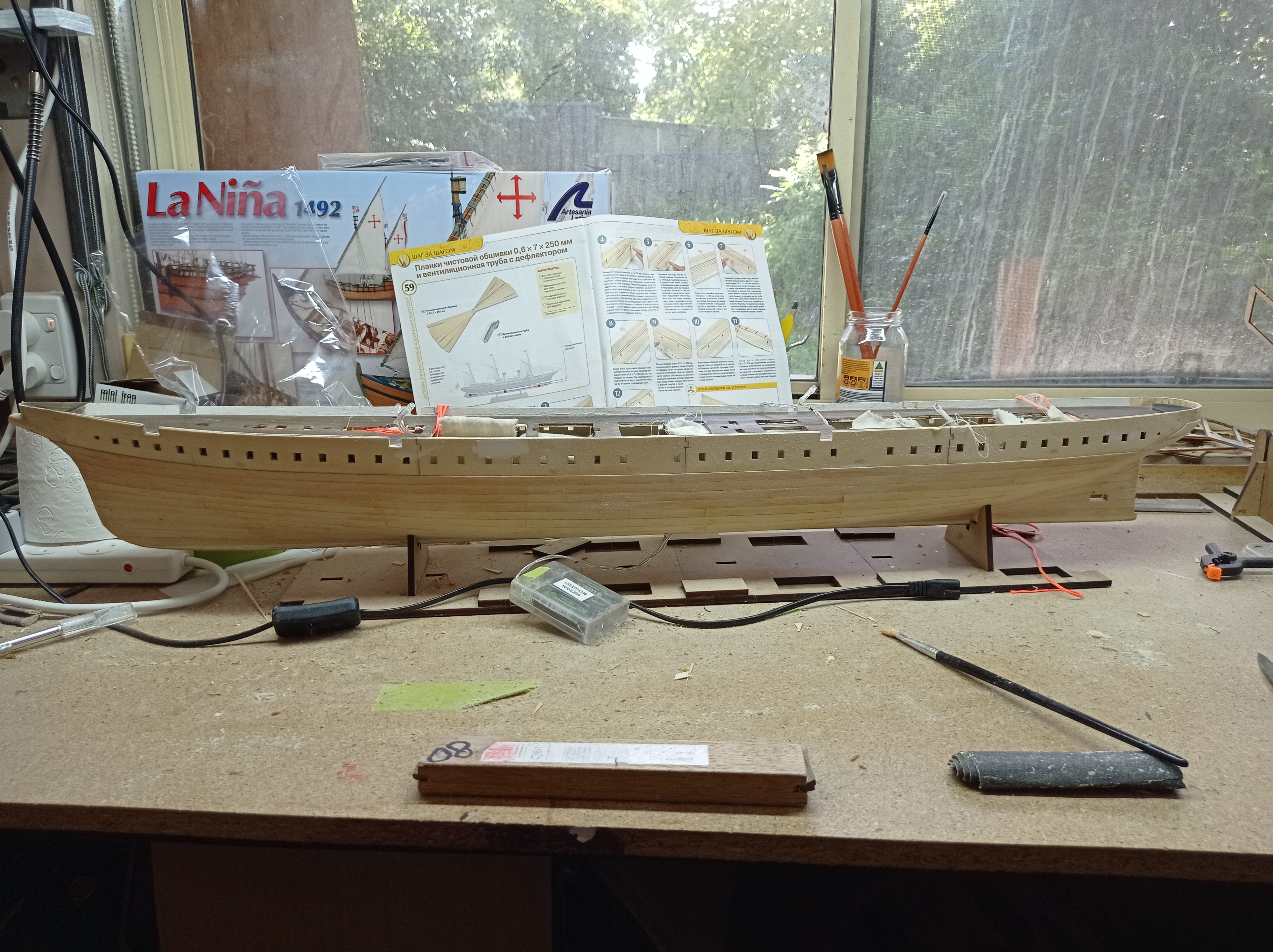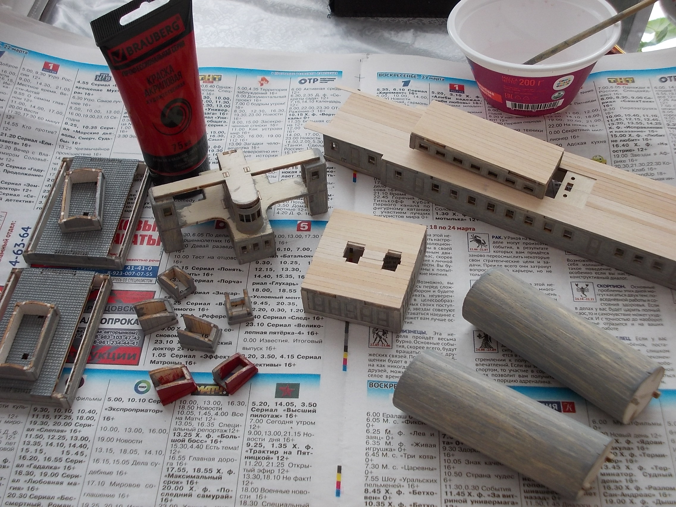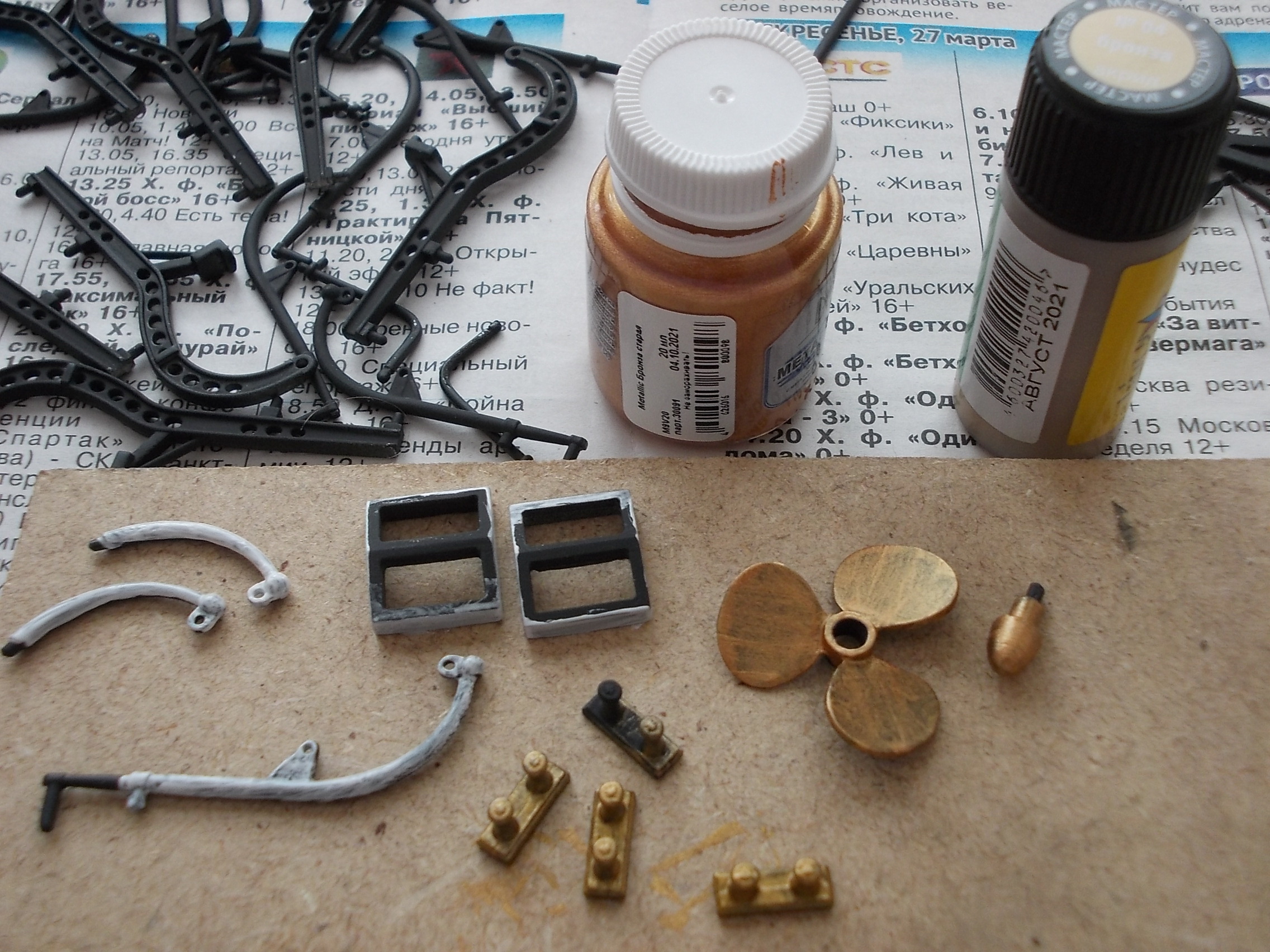 Как я уже писал, намешанной краски осталось очень мало, в лучшем случае, хватит на один слой на капитанский мостик и борта, поэтому химичу с двухслойной покраской.