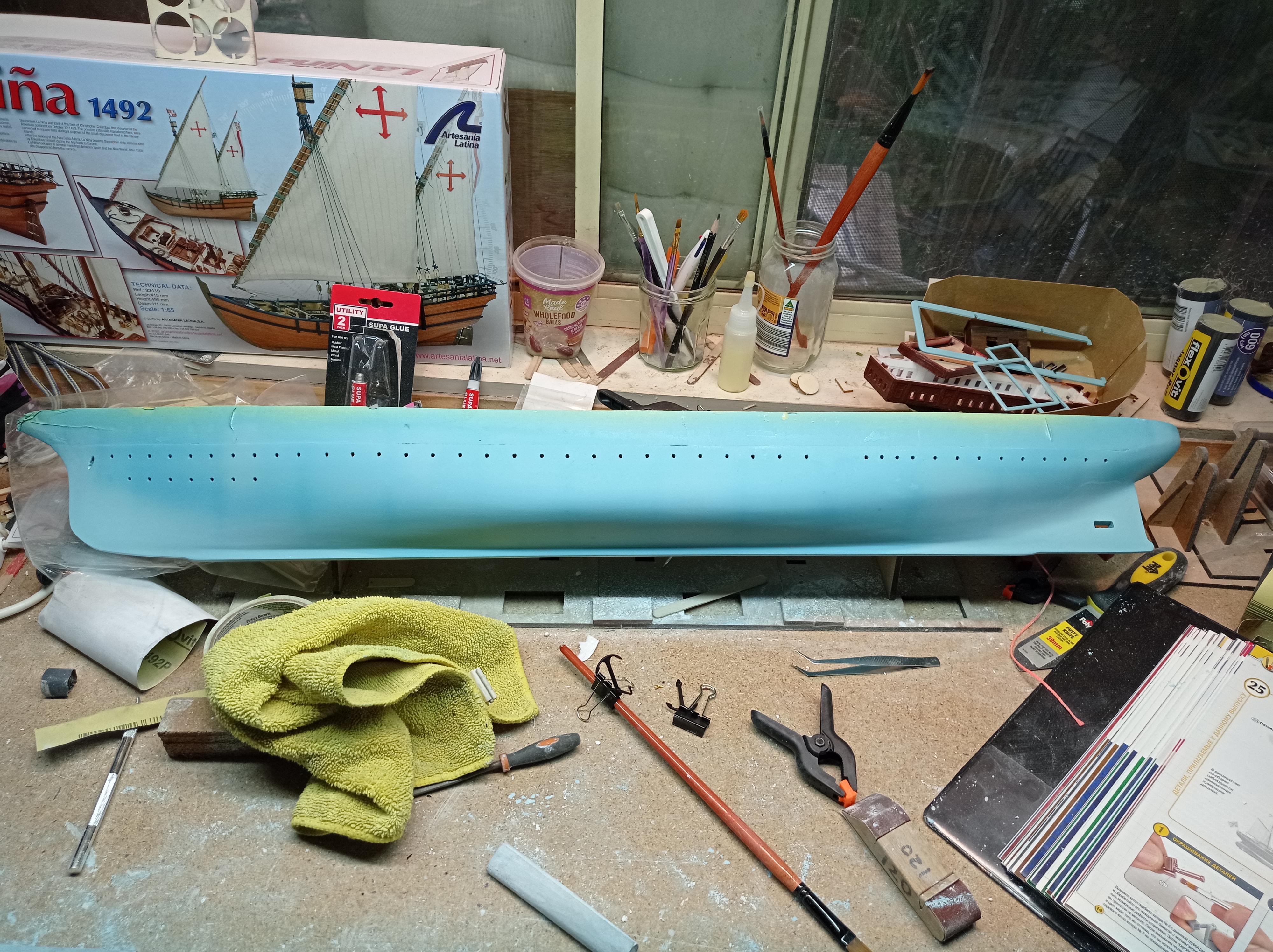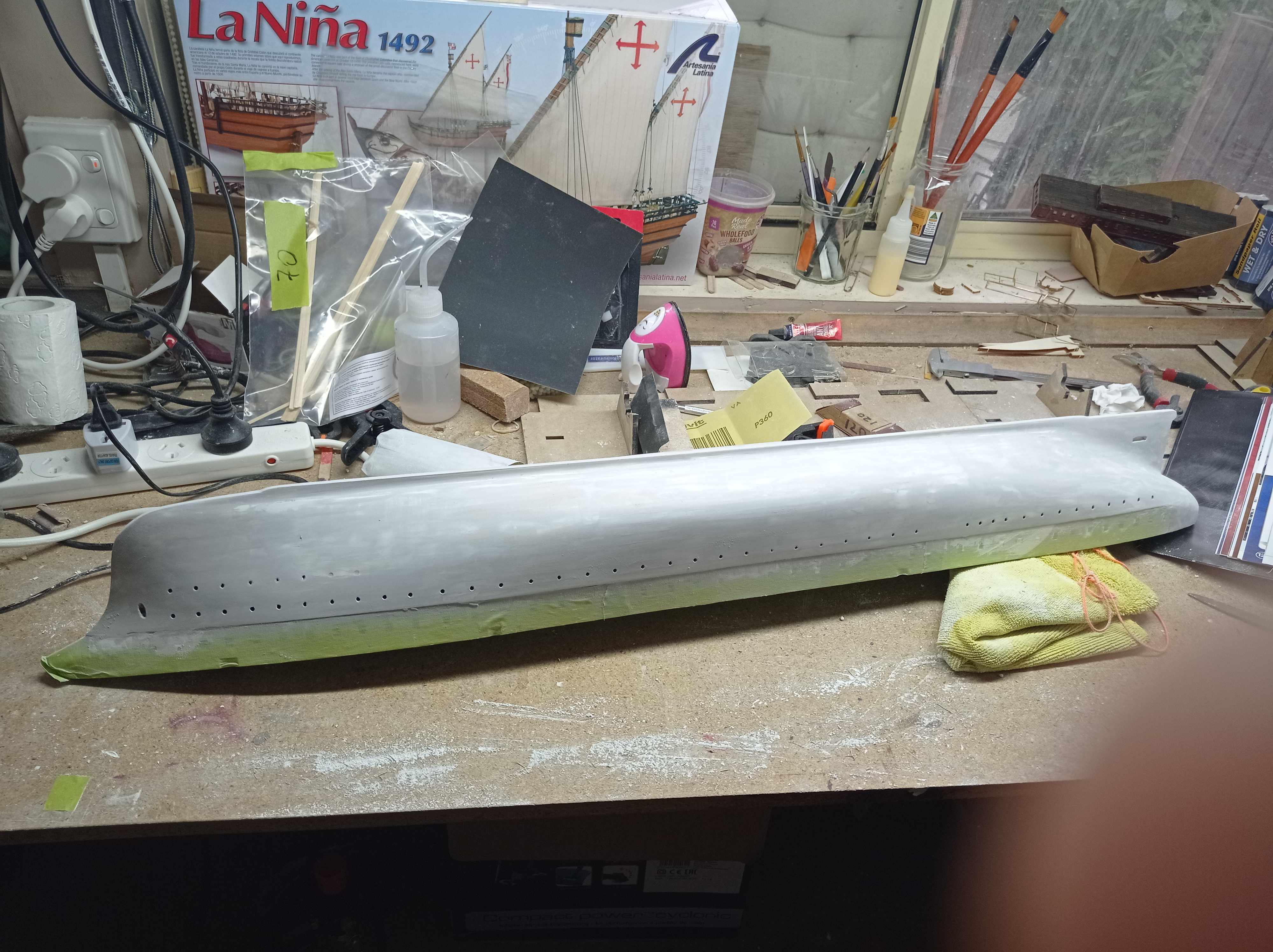 Очень понравилось грунтовка, продающаяся на "верфи на столе" по сути это финишная шпаклёвка. Может мне досталась подсушенная версия, но кистью ее наносить не возможно, а вот шпателем она ложится очень не плохо и шкурится тоже на ура.