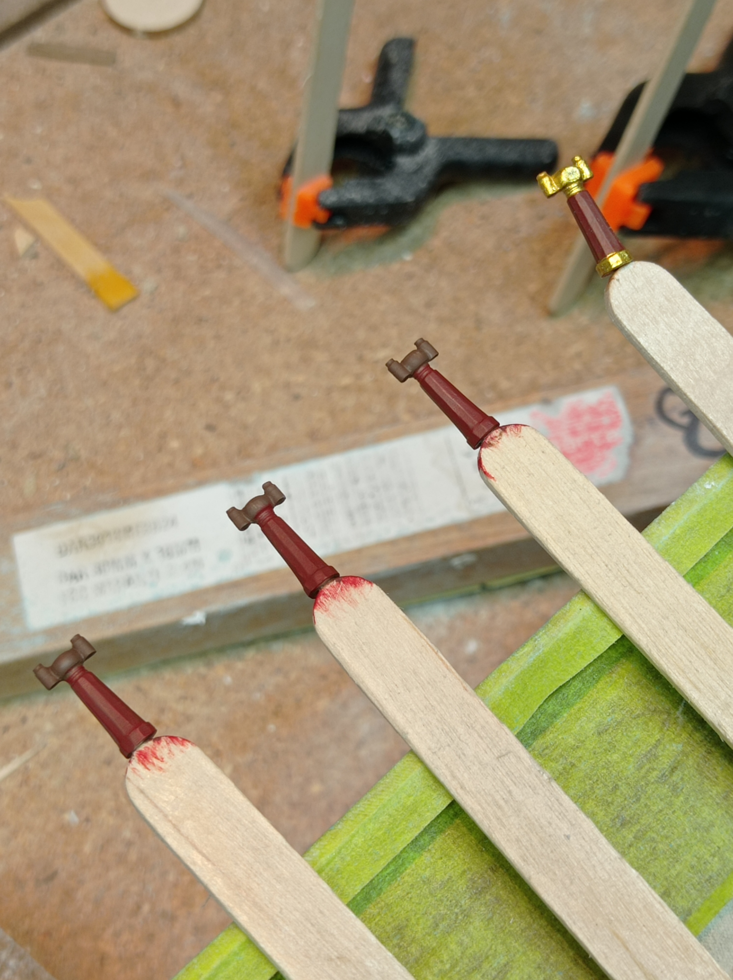 Пришло время на надстройки леерные стойки ставить и я подумал, что красить их после установки очень муторно занятие: