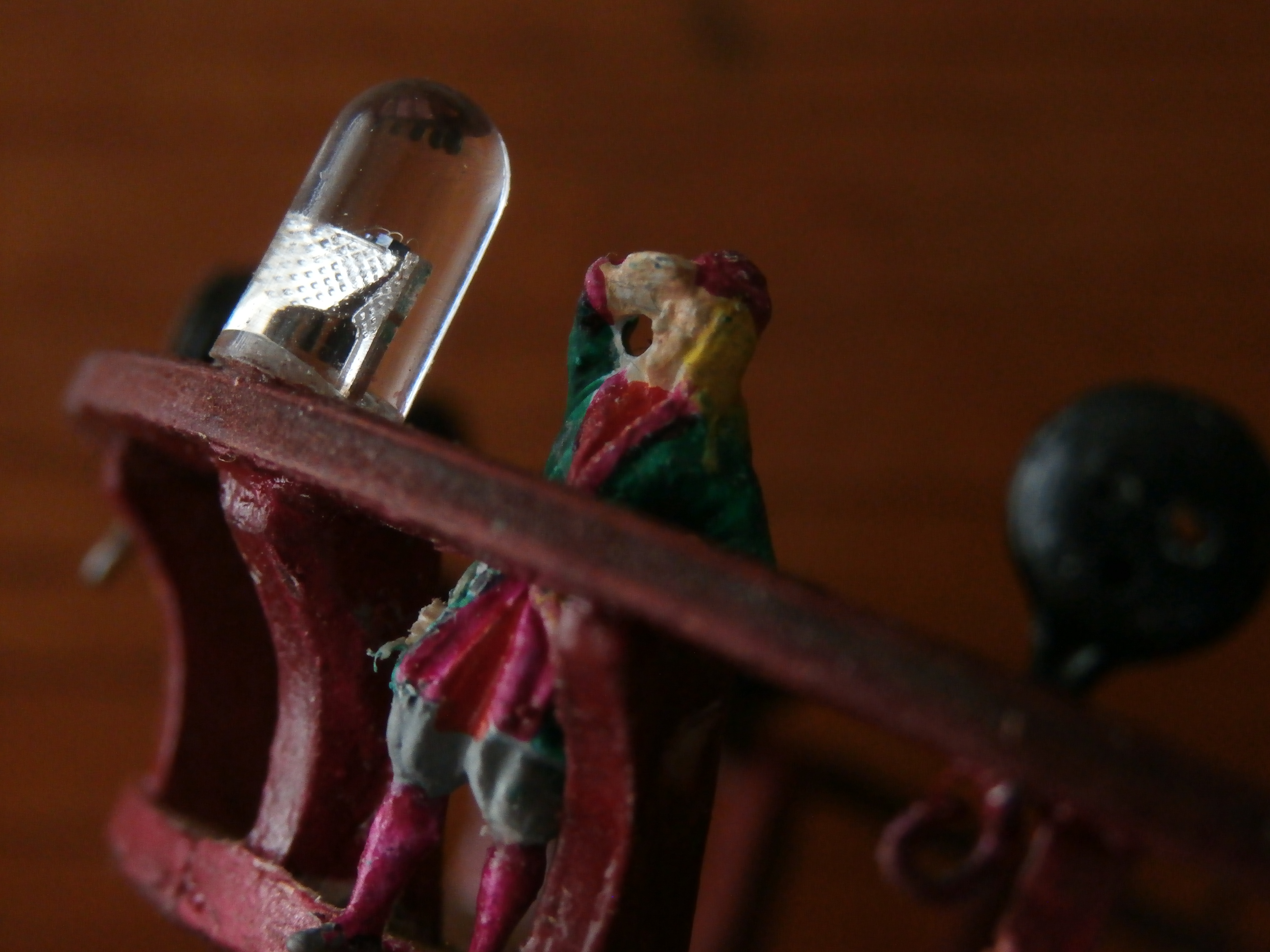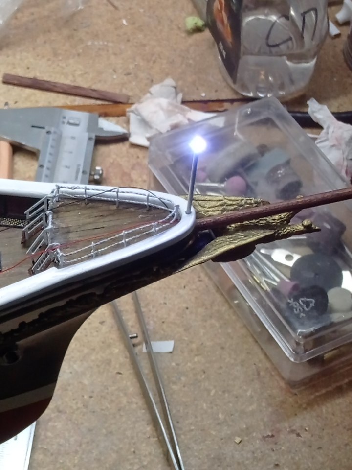 Вот как я решил у себя вашу проблему. У меня на "Повелителе" на фор-марсе матрос- впередсмотрящий.Фигурка матроса от патворка ДеА. На планшире марса корабельный фонарь, но сколько бы я не сооружал фонарь "под старину" получалось очень громоздко, топорно, грубо! Светодиод обычных размеров, фишка в нем - он красноватого цвета, мерцающий и дает очень слабый для светодиодов свет. Я и остановился на последнем варианте: Оставил светодиод без фонаря, думаю среди парусов, такелажа и рангоута корабля затеряется его - диода современный вид, но надеюсь при работе диода будут эффектно подсвечиваться низа пузов парусов ( фор- и грот-марсели) корабля.
