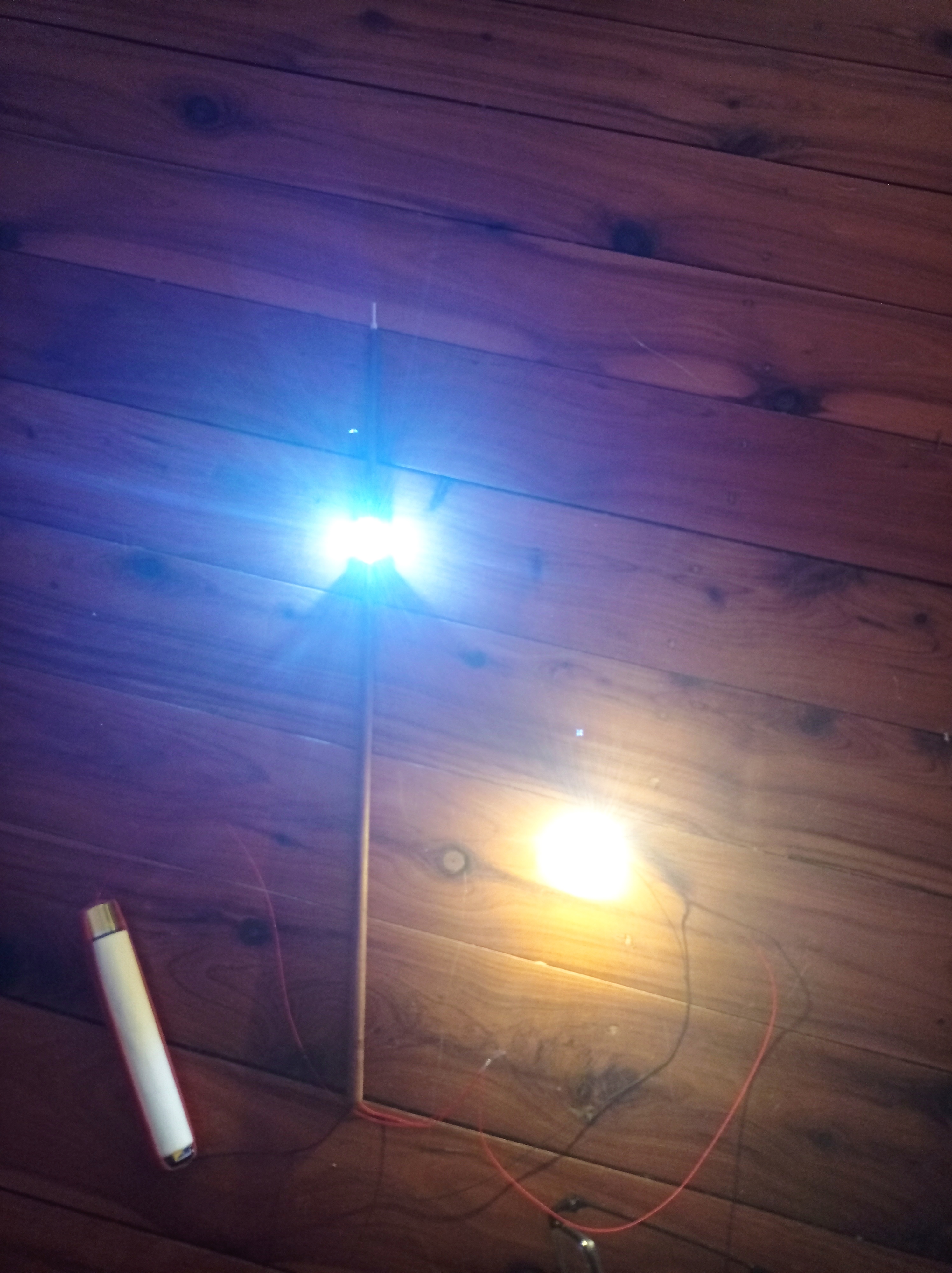 Шарик сформировался легко и самостоятельно. НО свет на выходе потускнел на порядок. Возможно за счет сажи, которую добавила зажигалка. Все осталось по-старому. Свет выходит из нити через капельку по старому - прямолинейно и совершенно не хочет выходить , как вы пишите "во все стороны". Через увеличительное стекло видно: что пластик световода по своей структуре не однородный. В центре нити обычный прозрачный пластик а по краям обложен тонкими прозрачными пластинками у которых рифленая структура и причем в одном продольном направлении. При плавлении пластинки, эти пластинки формируются в капельке в хаотичном состоянии. Наверное по этому, сила света в капельке падает.