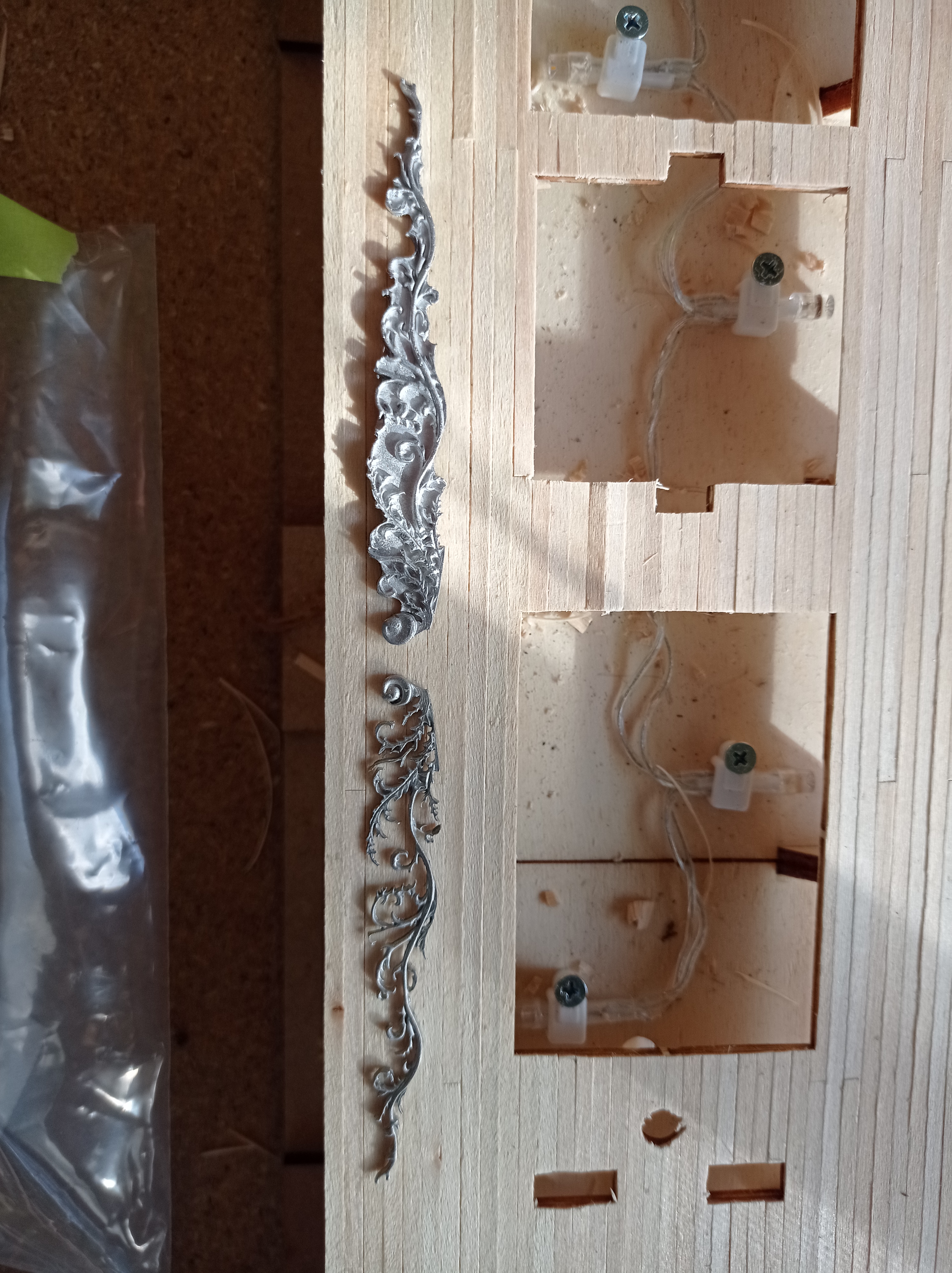 Пока суть да дело, сошкурил излишки одного из украшений.