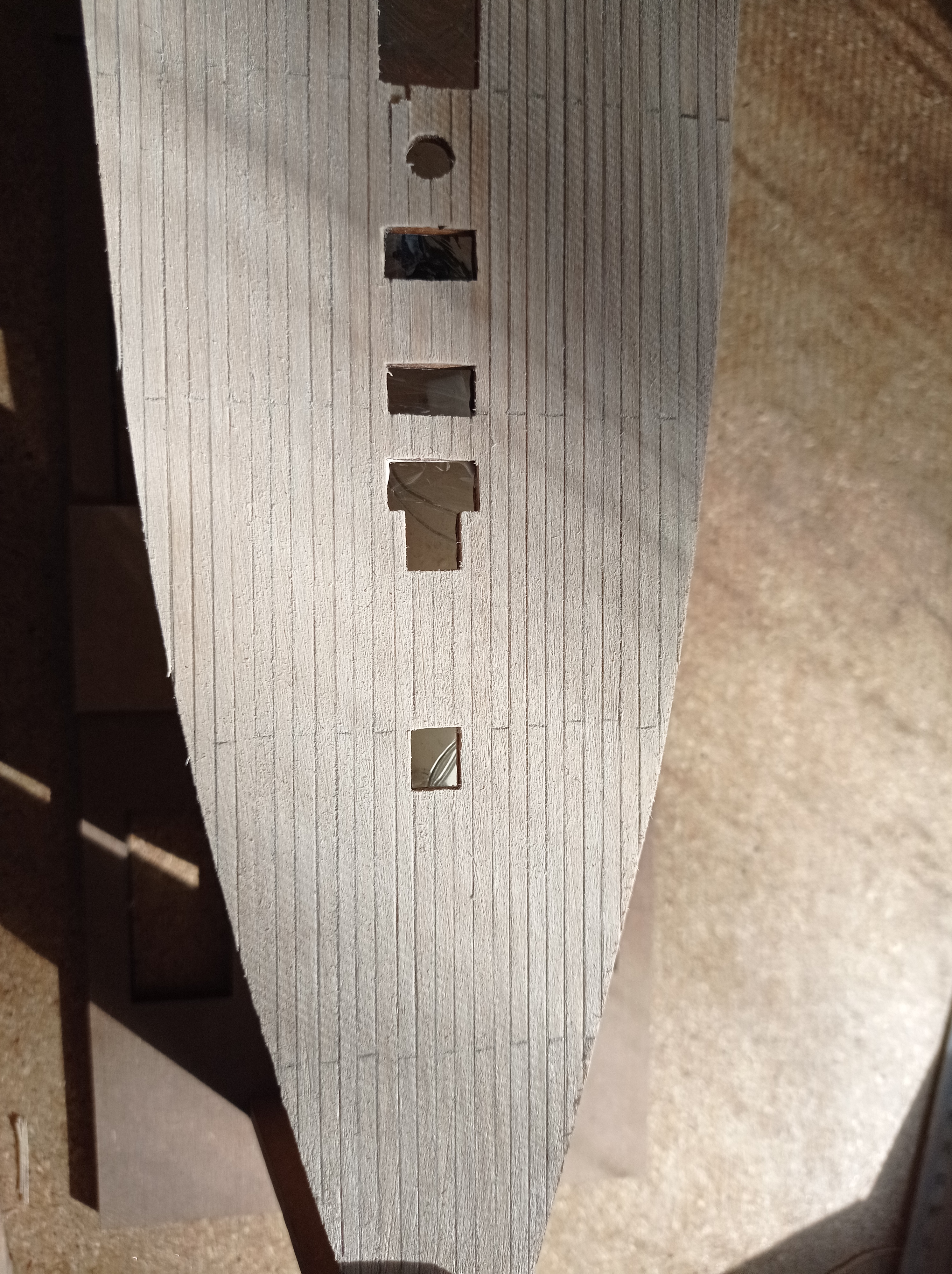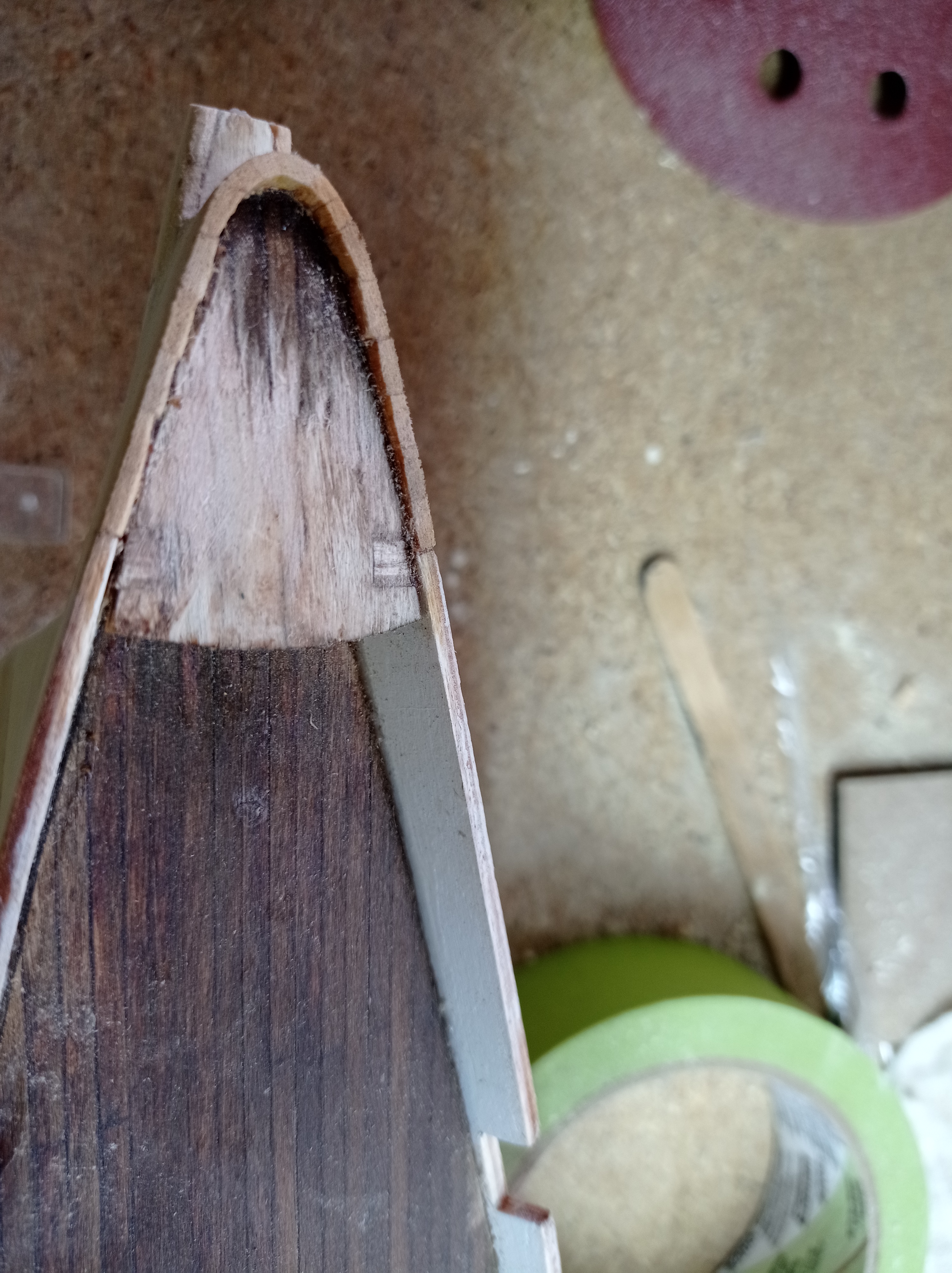 Поздновато обнаружил, что в корме, из-за сильного изгиба шпангоутов, между нижним и верхним рядами фанерной обшивки образовался зазор. Точнее, они примыкают по внутреннему краю, а по внешнему краю идёт щель. Надо было фаску снимать.