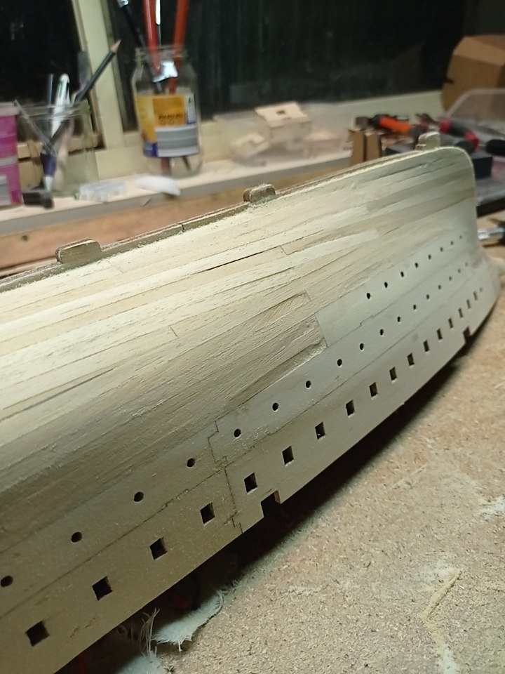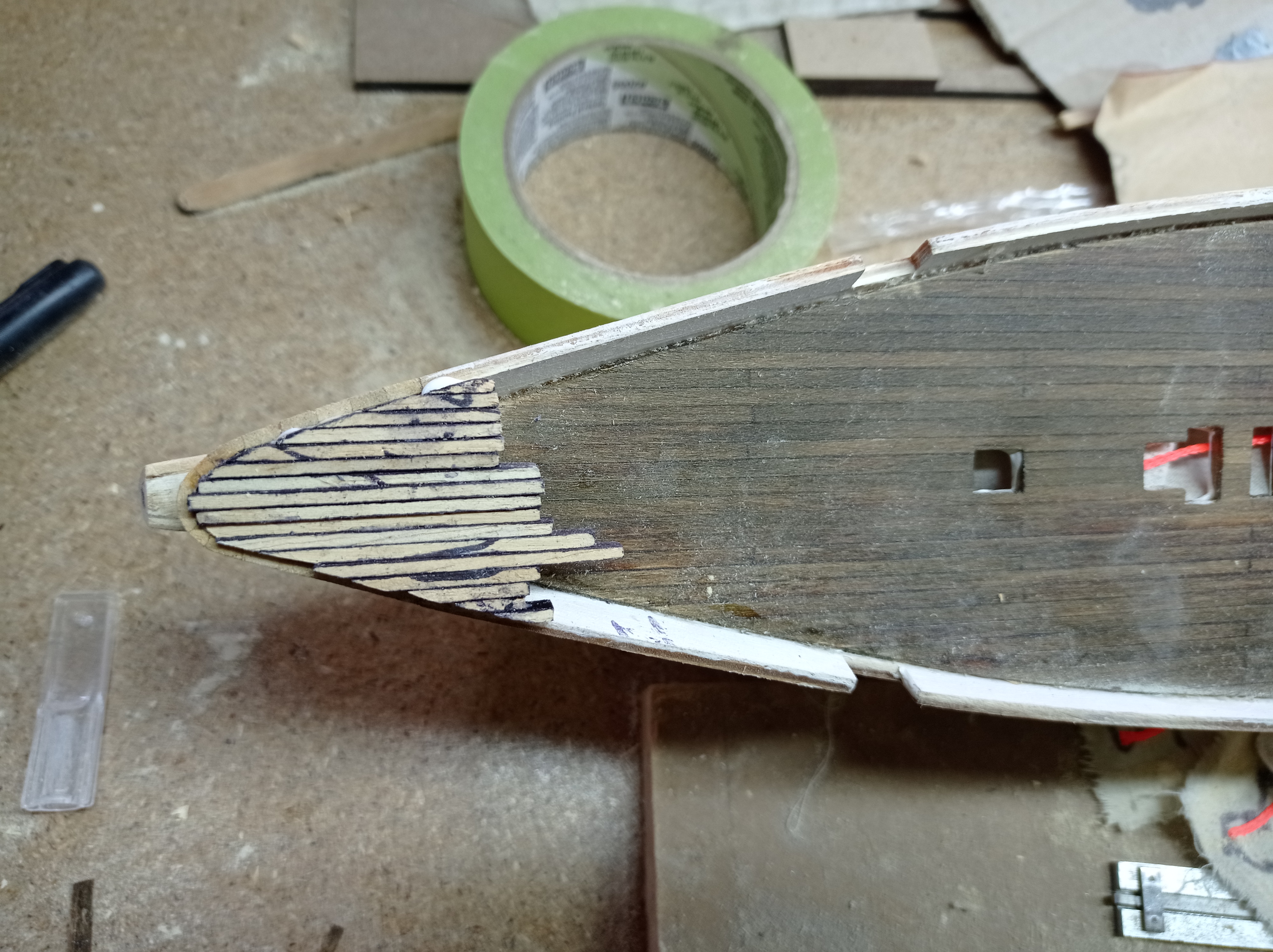 Планки палубного настила начал укладывать в шахматном порядке, но впоследствии пришёл к выводу, что лучше смотрится настил, когда стыки идут вразнобой, как на корме. Учту при постройке следующего кораблика.