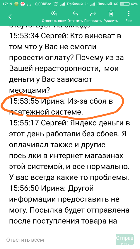 В прикрепленных файлах часть переписки от 10.01.18 и 19.01.18., разговор идёт об одной и той же посылки, но в разное время и с разными операторами.