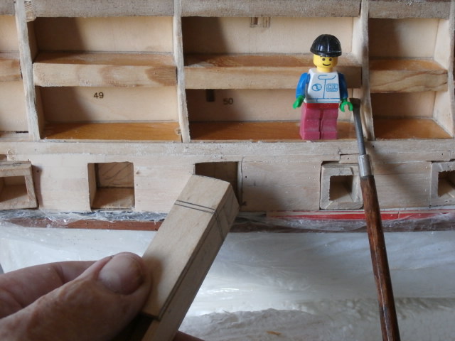 На борту модели я, как трамвайные пути наклеил 9мм бруски дерева, закрепленные на клей и нагеля- зубочистки между шпангоутами. Эти бруски в будущем помогут мне надежно закрепить площадки-руслени всех трех мачт моего корабля. Толщину брусков, я подогнал так , что сохраняя обговоренные размеры арт порта 12 Х 13мм ( размеры ДеА) мои порты будут изготовлены из 3мм по толщине, ученических угольников и эти порты "в натяг" будут входить на своё место между брусками. Эти же бруски будут дополнительной жесткостью в сооружении черновой обшивки модели. Заготовку портов я склеил из напиленных полосок от ученического треугольника. Для удобства работы при склеивании я изготовил дер. брусок со сторонами в 12 Х 13 мм. Он мне существенно помогает в работе. Для экономии материала заготовку я не стал распиливать на многочисленные заготовки портов гон-дека. Заготовку вставляю в предназначенное ей место , отпиливаю от заготовки порт . С внутренней стороны вставляю заглушку. 2мм сверлом сверлю в середине отверстие , для того что бы в будущем закрепив 2мм зубочистку, куда будет надет ствол фальш-орудия от ДеА.