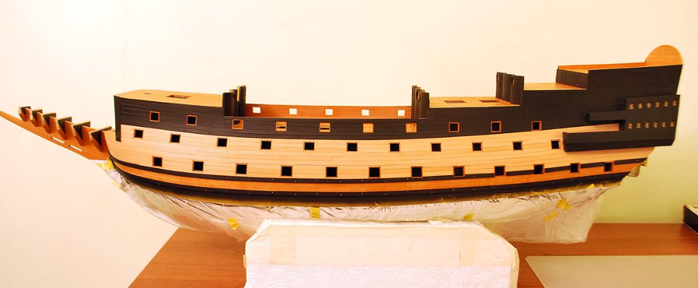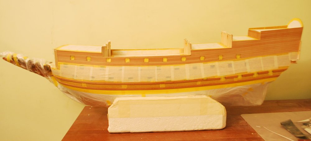 Покрасил днище в белый, но он маркий - надо закрыть пленкой до следующих работ с кормой и рулем. Поставил бархоуты из грушевой рейки 5x2 поверх чистовой обшивки. Закрыл перед покраской палубу масками из бумаги, борта - малярным скотчем, а самые видные места скотчем от Tamiya, он просто лучший. Запеленали, теперь в малярку!