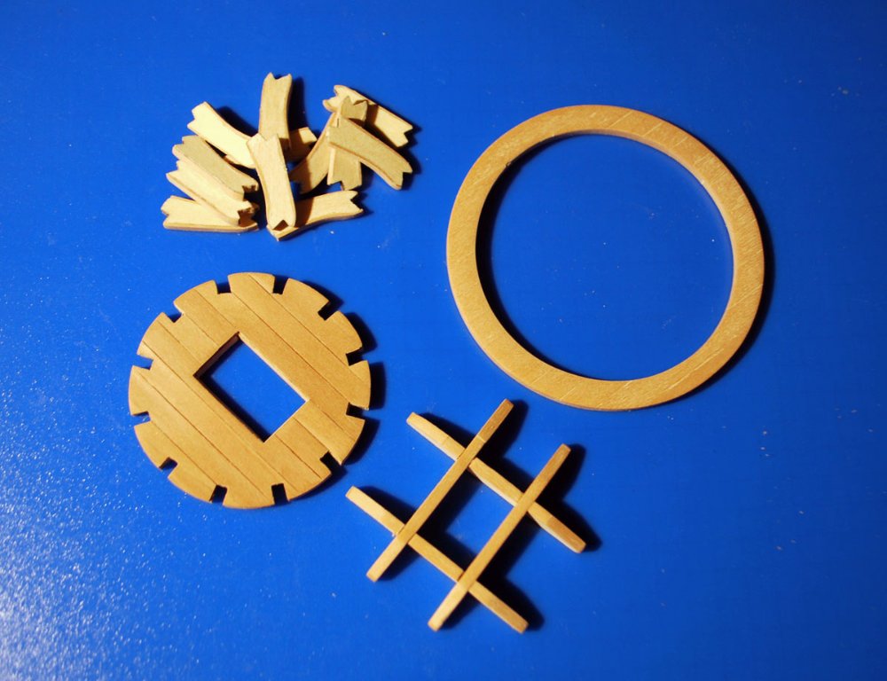 Сделал первое "воронье гнездо" из 95 выпуска. Когда начинал проект, думал что все торцы фанерных деталей закрашу краской и делов. Но потом пошло-поехало, начал заклеивать шпоном, выглядит лучше. Но тут такое количество деталей, что выходит очень трудоемко. Хотел было окрасить все черной краской, тем более что все планшири и перила у меня будут черные, но черные марсовые площадки из более поздней эпохи, а эти корзины в цвет дерева. По ходу дела еще и доски настила уложил на дно корзины.
