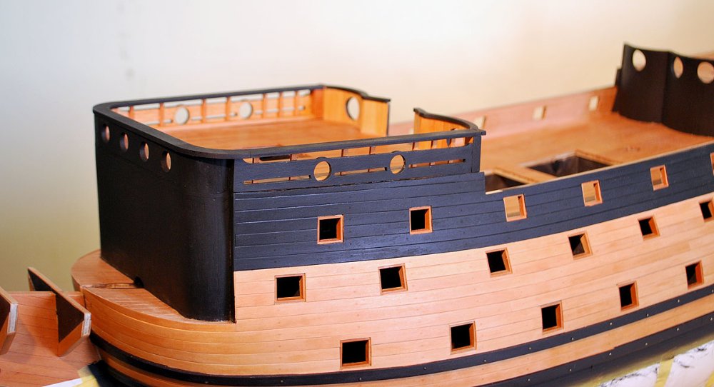 Закончил ограждение фордека и далось это нелегко. Боковины и детали планширя оказались на 5 мм короче моего фордека, пришлось доставлять обрезками. Цветовая гамма отличается от журнала - красного цвета не будет вообще, вместо него цвет дерева (груша), планширь классического черного цвета. Золотые блестяшки на ограждение со стороны палубы не буду ставить, они плоские и не похожи на скульптурное украшение. Да и скорее всего не было украшений с внутренней стороны борта, где на борт накатывалась пушка, а только снаружи.