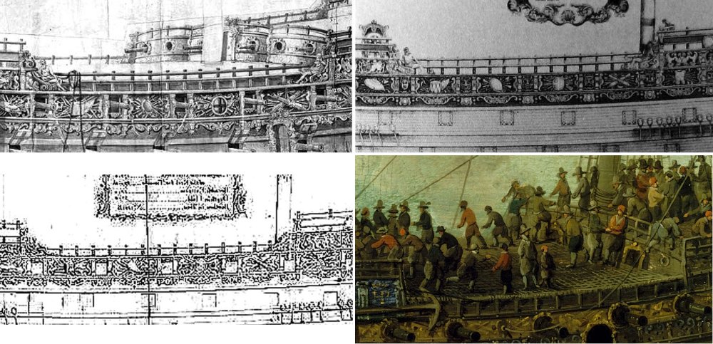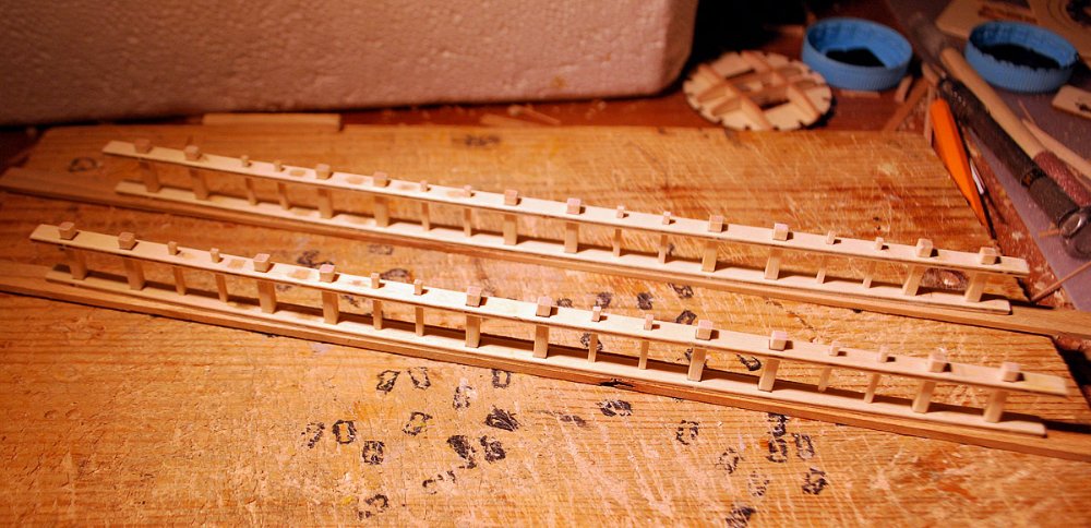 1. На опердеке все "столбики" одинакового сечения и являются продолжением ветвей шпангоутов. Разное сечение присутствует в ограждении ахтердека, так что журнальный вариант полуреален. Выполнить все ветви одинаковыми сложно из-за имеющихся отверстий в деталях, если переделывать то придется все.