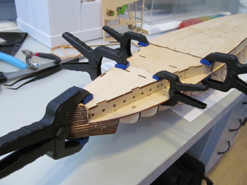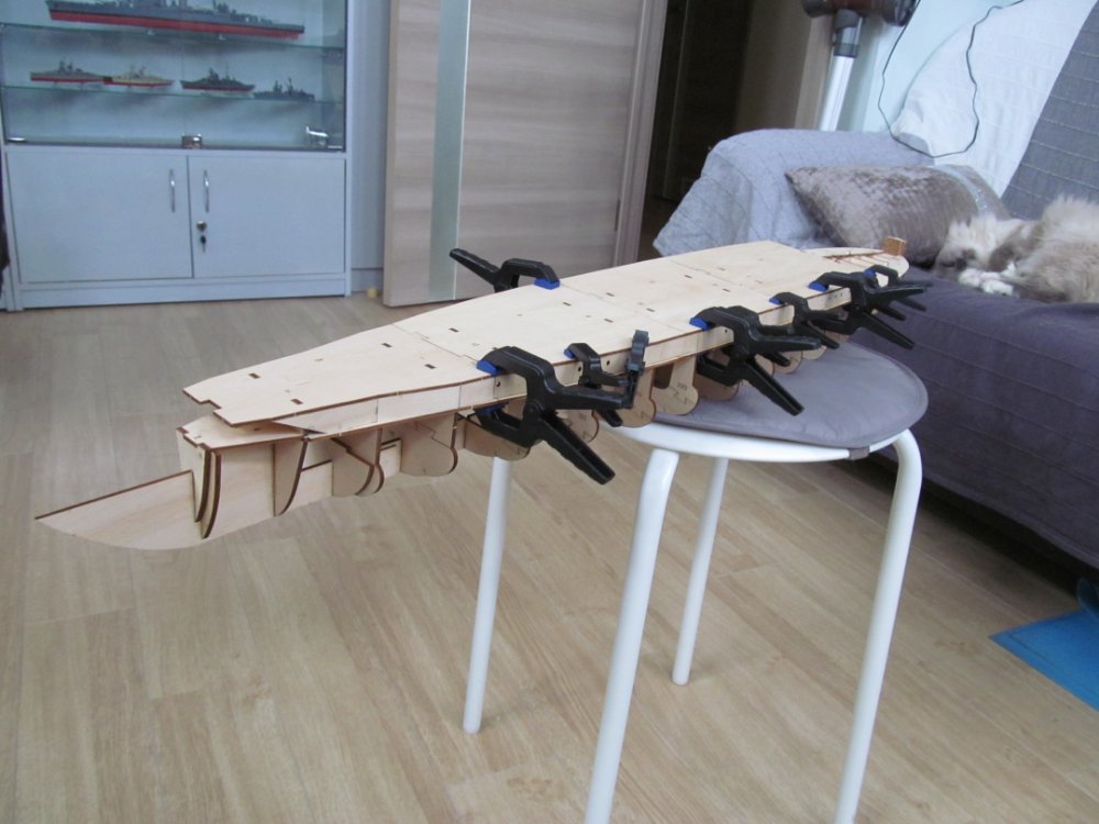 Алексей! У меня мысли об усилении килевой балки давно не дают спать тараканам в голове... Пока склоняюсь к вклейке брусков параллельно килю и сверлению по шаблону 2-х , 3-х соседних с местом установки гайки шпангоутов и вклейки в них круглых бамбуковых палочек от китайской еды. Оные возьмут на себя изгибающий момент от веса корпуса. В этом случае придется изменить порядок сборки каркаса, иначе палочки просто не получится установить. Гайку планирую заказывать у токаря в виде плоской шайбы (2-3мм) отверстиями под шурупы крепления к брускам и более тонкой трубчатой части с внутренней резьбой ( высота равна высоте килевой балки) для ботов крепления к подставке. Данная технология была отработана на Бисмарке и Адмирале граф Шпее.