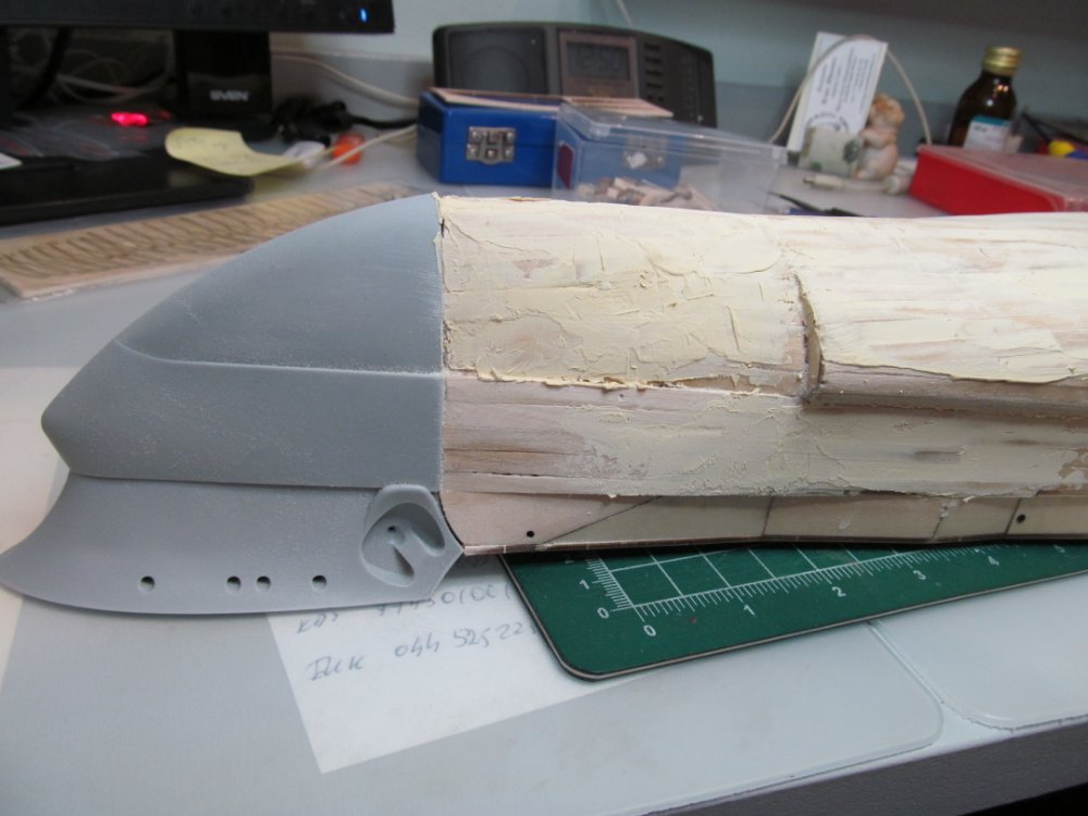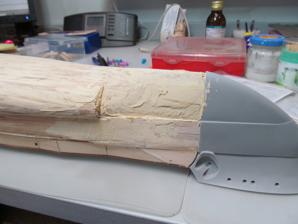 А сегодня я наконец-то прошкурил черновую обшивку корпуса и промазал слоем ПВА, разведённым в кипячёной воде.