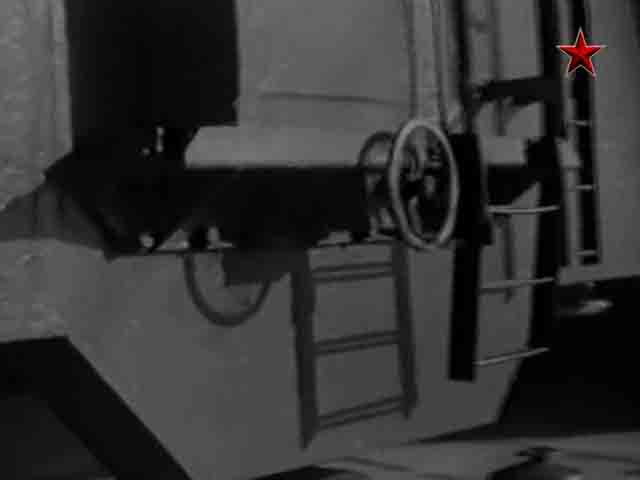 Здесь чётко видна конструкция кормовой стенки башни ГК с откатной дверью, противовесом и с трапом в бронеколпак башенного дальномера.