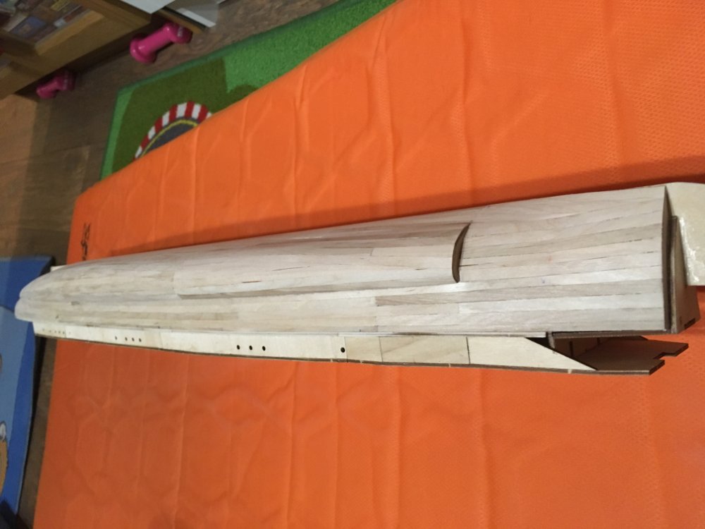 Almaz1188 прав , нужно докончить в том числе и с противоторпедными булями. Корпус вы сделали очень даже не плохо. По окончанию корпус следует обточить наждачной бумагой вначале номерами 80 - 120, а затем 300-400. Абразив должен быть наклеен ( можно наклеить и на двухсторонний скоч) на прямоугольные бруски дерева (сухарики). Для корпуса лучше изготовить "сухарики" продолговатыми по длине чуть больше шпации . ( Шпация - это расстояние между соседними шпангоутами) При обточке все время проверяйте вдоль корпус на просвет. Если сильно нажимать обтачивая, увлекаясь - можно нечаянно получить эффект "старой лошади" Это когда на просвет шпангоуты будут выпирать как ребра у клячи. Поэтому сухарик нужно вести не сильно нажимая на корпус модели. После обточки советую весь корпус (днище и борта ) покрыть двумя слоями, с просушкой между слоями, жидко разведенного клея ПВА. Концентрация раствора примерно - жидкие сливки. Воду для раствора советую брать кипяченую примерно комнатной температуры. Кипячёная вода - "мертвая вода" иначе в корпус модели можно занести споры плесени. Клей ПВА в принципе родственник по своей сути современным акриловым и шпатлевкам и грунтовкам и краскам. Поэтому на корпус обработанный ПВА, хорошо просушенный, очень хорошо ляжет в проблемных местах акриловая шпатлевка. Хорошо лягут на клей и рейки чистовой обшивки. Удачи Вам и Здоровья!
