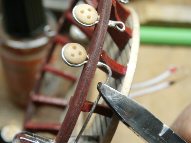 -Я пробовал чернить, но возможно чернилка ( она у меня американская) постарела, возможно из за того что проволока покрыта оловом - чернить отказалась. Так как юферсы у меня тоже будут черного цвета. Перед покраской я нанесу грунтовку и на юферсы и на металл вант-путенсов, а уж потом краской все покрою черным цветом...