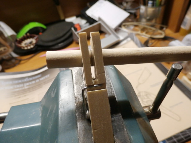 очередной раз заглянул на городской рынок. Торговали - белорусы. Наткнулся на очень красивые изготовленные из березы - прищепки. Сразу купил тридцать штук. Бельевые прищепки очень универсальный, дешевый и удобный инструмент. Раньше я как то без особого внимания проходил мимо. Березовое тело хорошо сверлится, режется, клеится. Сама цена прищепки не большая и если рукодельничая испортил - не страшно - выкинул , взял другую. Но у прищепок есть один минус. Три детали из которых состоит прищепка - стандартны. Отсюда и зев стандартной прищепки только 13мм! а если этого мало, если нужно склеить пакет шпона или несколько деталей по толщине более 13 мм? Для этого я и "изобрел" -двойную, (склеенную из двух прищепок) у которой зев в 35 мм! Могу с гордостью сказать. Вот эту (двойную)придумал я! без папы и без мамы и дядечки из ДеАГостини! Очень часто стандарт губок прищепки мешает мастеру. Слишком длинные губки или слишком широкие. Часто ранее забитый обушок или металлическая стойка а то и блочек с шкертиком в тело рея становится "камнем преткновения" дальнейшей оснастки этого рея. Выдернуть не хочется - ослабишь гнездо, появится пятно от использованного клея. Вот как раз прищепка и продольным разрезом и поможет в этом случае. Идея автора статьи не в том , что для каждого конкретного случая нужно изготовить особенную прищепку, а иметь целый набор "прищепок - заготовок" с различными по длине,толщине и ширине и самой форме губок. И при каждом конкретном случае можно быстро подогнать эту заготовку к конкретному случаю. Это так , как я поступил с прищепкой для монтажа юферсов в вант-путенцы...