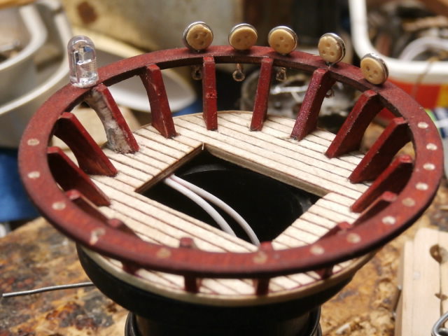 В прошлых постах я уже писал о том, что запланировал на (Фок и Грот мачтах) модели установить два фонаря на нижних марсовых площадках. Я собирался установить в "Вороньем гнезде" металлические фонарики от декоративных брелоков. Но при нашем масштабе сооружать действующий фонарь сложно. Слишком мало места внутри брелока. Не стал я испытывать судьбу и просверлив два 0,5 мм отверстия в планшире "Вороньего гнезда" пропустив выводы светодиода и наклеив все, в том числе выводы и корпус светодиода на секундный клей я получил такого рода имитацию корабельного фонаря. Должен сказать, что корпус светодиода миниатюрен (5 Х 6 мм.) Свет от него очень слаб. (Он работает как заженная свеча то потухая, то ярко вспыхивая желтым светом.) В окружении парусов и такелажа, думаю его форма не будет уж сильно заметная для зрителей и не так критична! Оба вывода я наклеил с обоих сторон кормовой стойки планширя на секундный клей, а затем нанес шпатлевку. В окончательном варианте стойку вместе с выводами я закрашу под цвет самого гнезда. Покупать или сооружать корабельные фонари на такой миниатюрной площадке , по моему убеждению будет грубо,( на уровне детской игрушечной кареты.)