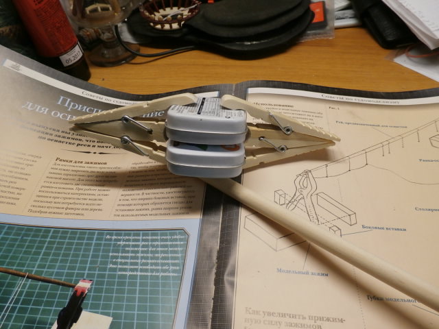 очередной раз заглянул на городской рынок. Торговали - белорусы. Наткнулся на очень красивые изготовленные из березы - прищепки. Сразу купил тридцать штук. Бельевые прищепки очень универсальный, дешевый и удобный инструмент. Раньше я как то без особого внимания проходил мимо. Березовое тело хорошо сверлится, режется, клеится. Сама цена прищепки не большая и если рукодельничая испортил - не страшно - выкинул , взял другую. Но у прищепок есть один минус. Три детали из которых состоит прищепка - стандартны. Отсюда и зев стандартной прищепки только 13мм! а если этого мало, если нужно склеить пакет шпона или несколько деталей по толщине более 13 мм? Для этого я и "изобрел" -двойную, (склеенную из двух прищепок) у которой зев в 35 мм! Могу с гордостью сказать. Вот эту (двойную)придумал я! без папы и без мамы и дядечки из ДеАГостини! Очень часто стандарт губок прищепки мешает мастеру. Слишком длинные губки или слишком широкие. Часто ранее забитый обушок или металлическая стойка а то и блочек с шкертиком в тело рея становится "камнем преткновения" дальнейшей оснастки этого рея. Выдернуть не хочется - ослабишь гнездо, появится пятно от использованного клея. Вот как раз прищепка и продольным разрезом и поможет в этом случае. Идея автора статьи не в том , что для каждого конкретного случая нужно изготовить особенную прищепку, а иметь целый набор "прищепок - заготовок" с различными по длине,толщине и ширине и самой форме губок. И при каждом конкретном случае можно быстро подогнать эту заготовку к конкретному случаю. Это так , как я поступил с прищепкой для монтажа юферсов в вант-путенцы...