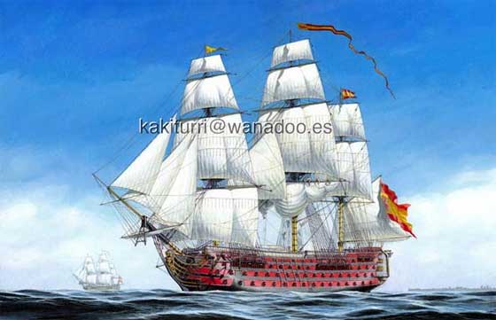 а это "Линейный корабль «Santisima Trinidad» был спущен на воду в 1769 году в Гаване. Он стал самым большим судном своего века и прослужил испанскому флоту 35 лет. Корпус корабля, включая палубы, изготовили из достаточно дорогого и прочного материала – кубинского красного дерева, толщина бортов 60 см! Корабль был практически непотопляемым"