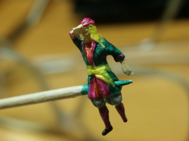Посмотрев и сравнив у Насекомых размеры марсовых площадок нашей модели я понял, что большая из двух будет установлена или на фок или грот мачтах Значит кроме фонаря из дополнительного оборудования нужно сюда установить еще и "матроса-впередсмотрящего". Он у меня оказался инвалидом. Без левой ступни! По опыту знаю инвалиду что б не оказаться за бортом ,нужно служить рьяно - за двоих. Иначе не доживешь до берега. Что бы впередсмотрящий не потерялся, я его решил не только приклеить клеем но предварительно просверлив 1,5 мм сверлом пришпилить к стойке планширя 1,5 мм зубочисткой на клей ПВА. Система подготовки та же. Надфилем аккуратно убираем заусенцы. Обезжириваем фигурку ацетоном. Покрываем акриловой грунтовкой.