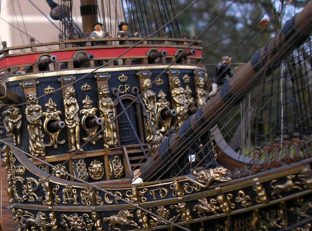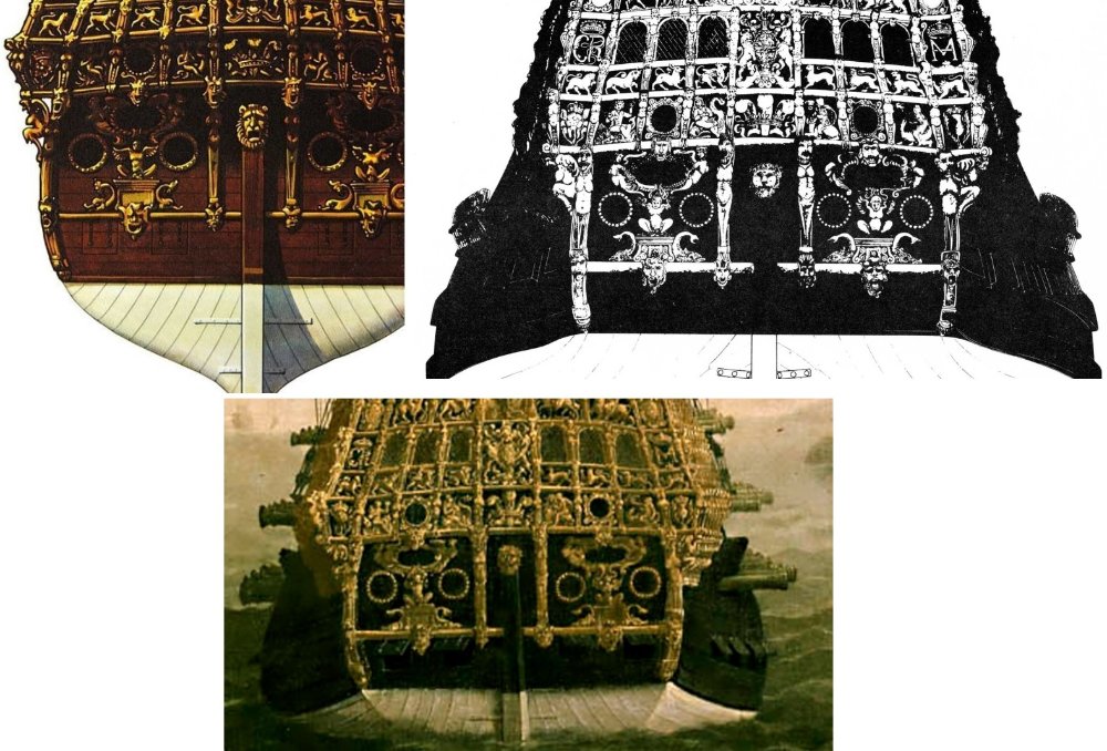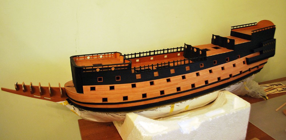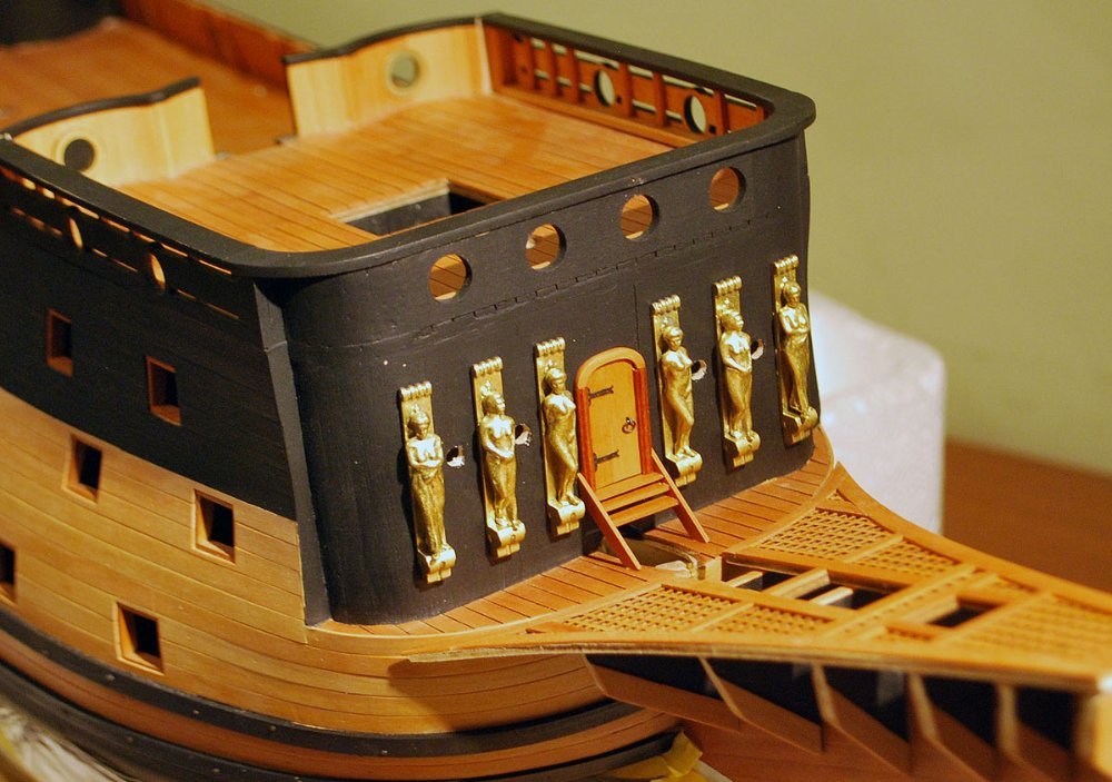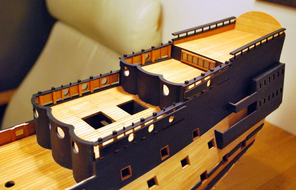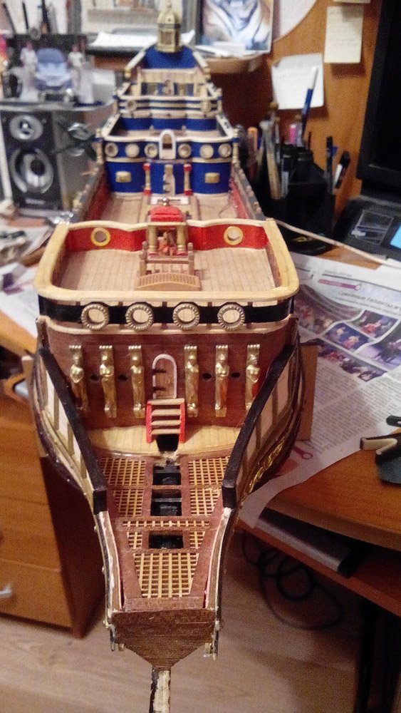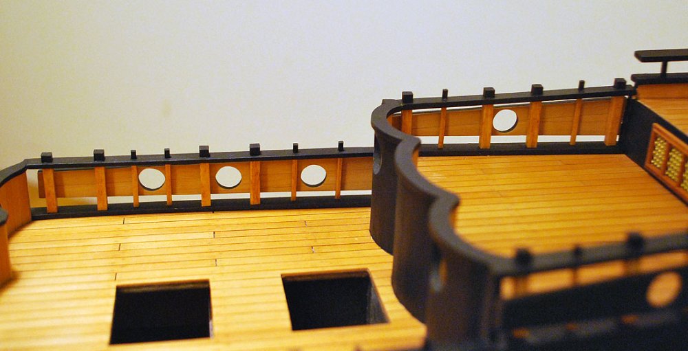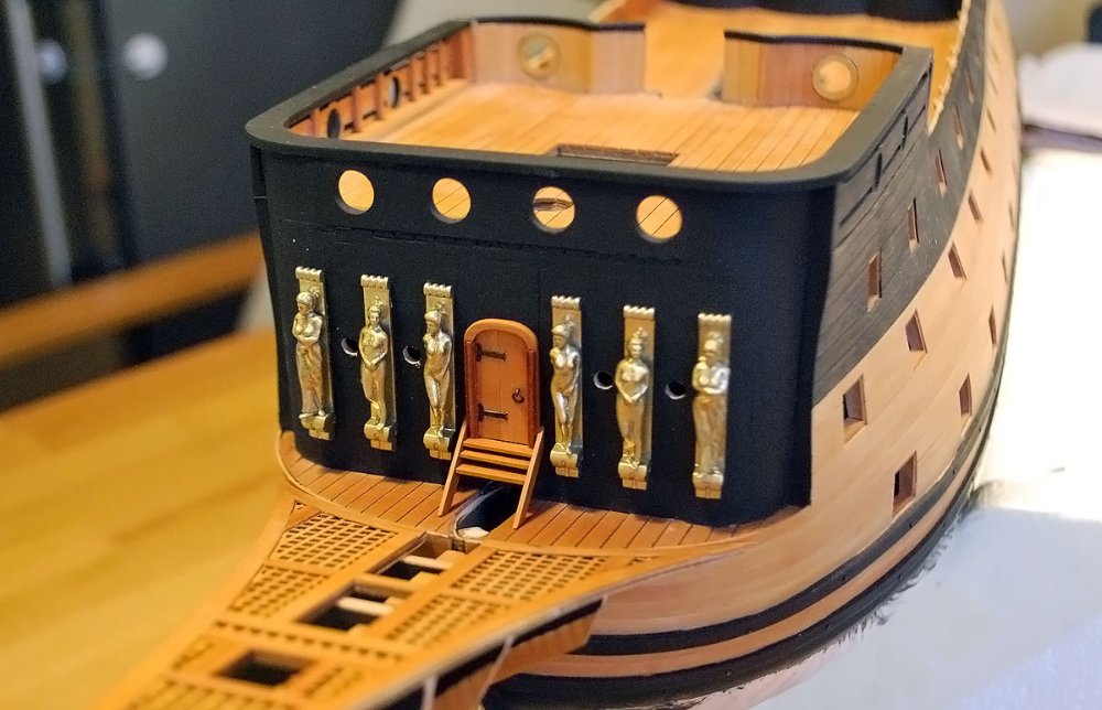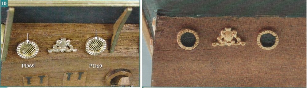 Не нравятся мне эти фанерные люк-порты, да и народ жалуется, что крошатся они. Технологию в журнале придумали убогую - наклеить, потом изнутри покрасить черным, в итоге все перемазано краской. Зачем меняли, в иностранной сборке с сеточкой смотрелось гораздо аккуратнее. С уменьшением размера тоже не понял, зачем? Раньше кормовые люк-порты были такого же размера как и бортовые. Из-за большей копийности? Так нет же, на изображениях кормовые люк-порты большие, размером с пушечный порт, а то и больше, это четко видно. Короче, хочу как у иностранцев было сделано, осталось только скопировать с металлических нужное количество круглых деталей.