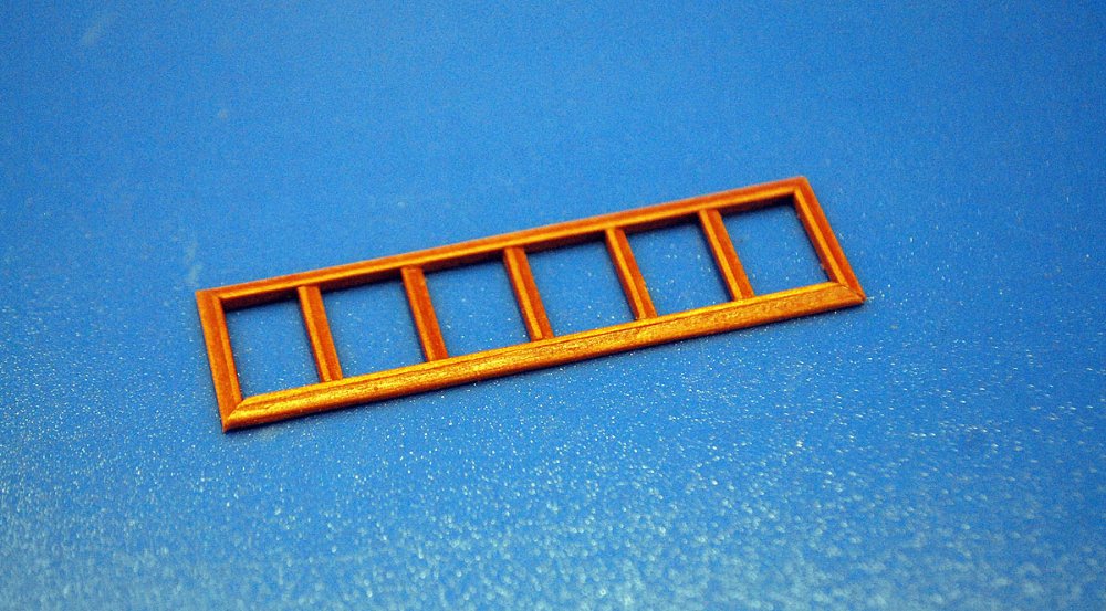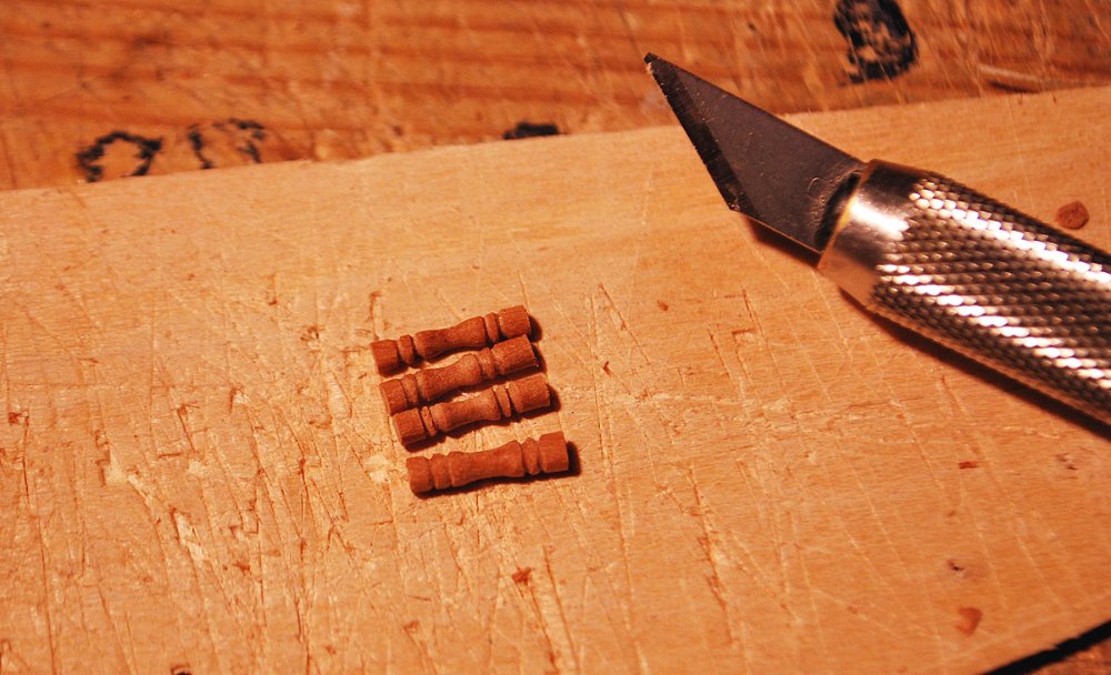 Ну а пока продолжу пилить ограждения палуб, которые тоже доставляют немало хлопот. Решил сделать перила и оконный переплет из 80 выпуска. По обыкновению все видимые детали стараюсь сделать из груши, так было и с оконным переплетом. Но вот рейки из груши никак не хотели поддаваться шейперу - волокна задирались, кромки смазывались. Перепортил кучу реек, раза с десятого пришел к тому, что изначально квадратной в сечении рейке надо сначала придать похожий провиль шкуркой, а шейпером только подправить, выделить кромки. Пыхтел-пыхтел и вроде вышло. После шейпера еще поскоблил кромку острием ножа.