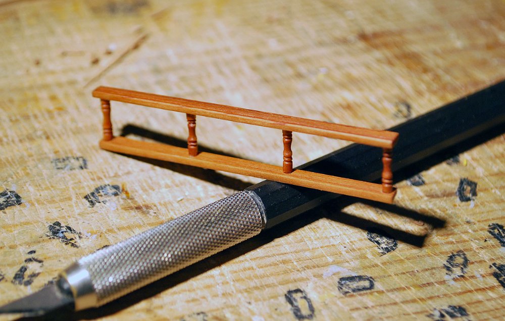 Хотел немного полениться и перила из 80 выпуска поставить как есть, собрать фанерные детали и окрасить в черный цвет. Но не судьба - при попытке снять надфилем нагар деталь сломалась. А раз делать заново, то можно и заморочиться. Верхнюю часть сделал широкой с кантиком по краям. Кантик процрапал шейпером, сделав "зуб" надфилем. Стойки выточил надфилем из реек 2x2 мм, зажав их в патроне Dremel. Хотел окрасить черным, как и боковое ограждение, но в итоге победил цвет дерева под маслом.