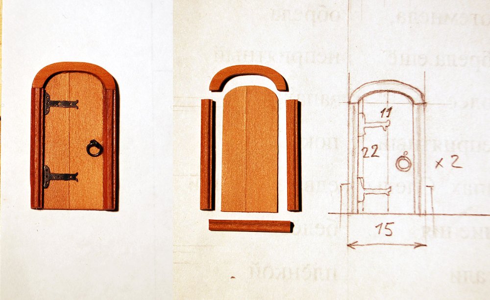 Делаю косяки арочных дверей и проёмов по другому.По периметру готовой двери нужной формы наклеиваю в 3-4 слоя тонкие (0,5мм) рейки предварительно размочив их в горячей воде потом обработка покраска и т.п. Также можно изготавливать арочные проёмы используя оправку нужной формы.Sniper писал(а): ↑18 янв 2019, 20:56 Арка двери оказалась твердым орешком. Сначала несколько раз пытался согнуть планку, но слишком малый радиус дал о себе знать - дерево ломалось. Пришлось выточить арку из широкой планки, да и это далось как обычно только с третьего раза. Боковые косяки после шейпера приняли солидный вид. Кольцо из какой-то проволоки, сверху петель и кольца американская чернилка Brass Black.