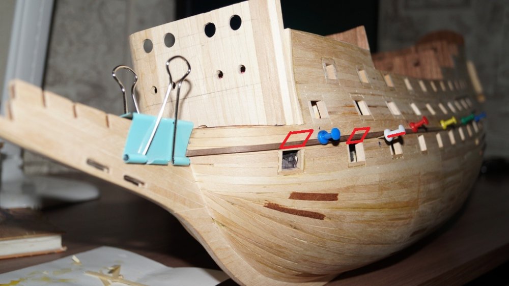 Чистовую обшивку хочу начать с бархоутов, рейки для которых в начале недели получил. И возникает вопрос, как кто будет крепить крышки пушечных портов. К бархоуту или к четверти, оставленной вокруг портов рейками? Или ещё как?