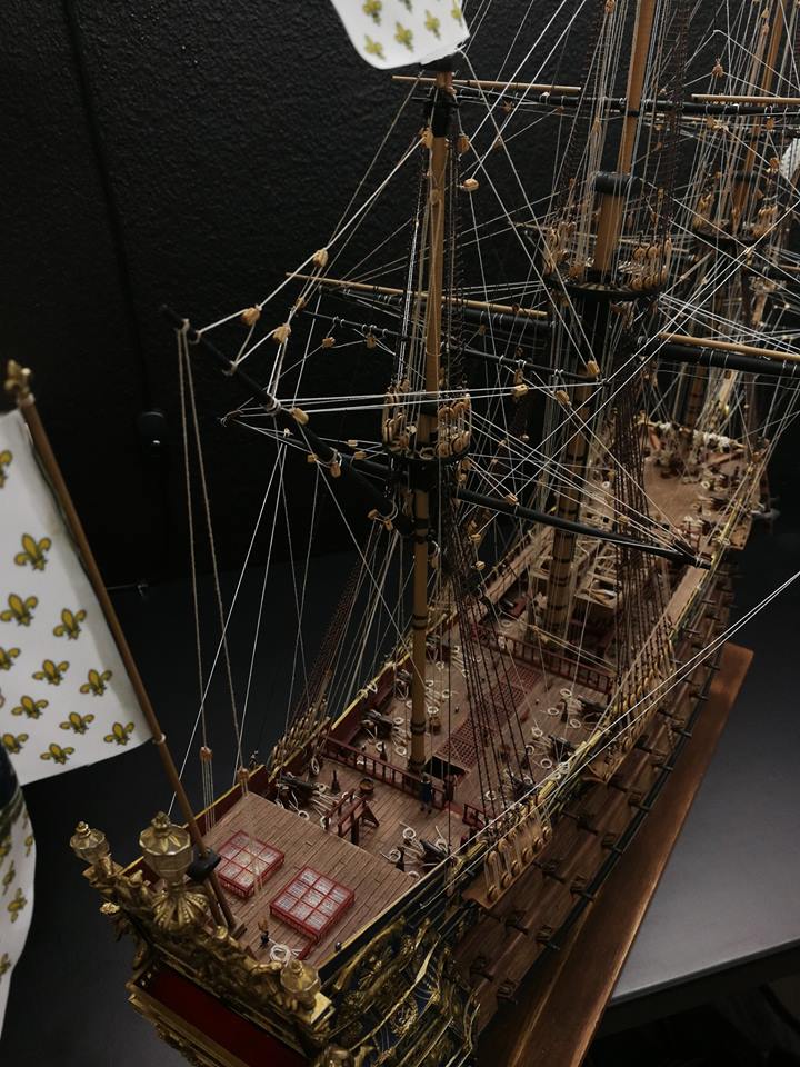 Продолжение. Этот корабль хоть и был одним из флагманов Королевского флота, не использовался и до 1688 года простоял в бухте Бреста. Переоборудован в 1688-1690 годах, а скорее всего полностью перестроен.«С его 2000 стволами и 110 орудиями, его черным корпусом, белым, синим и крабообразным, вырезанным золотыми веревками, это было превосходное здание», - пишет Франсуа Блюш, французский специалист по историческим наукам времен Людовика XIV. (перевод с оригинала) В украшении корабля появляется изображения солнца, символа Людовика XIV.